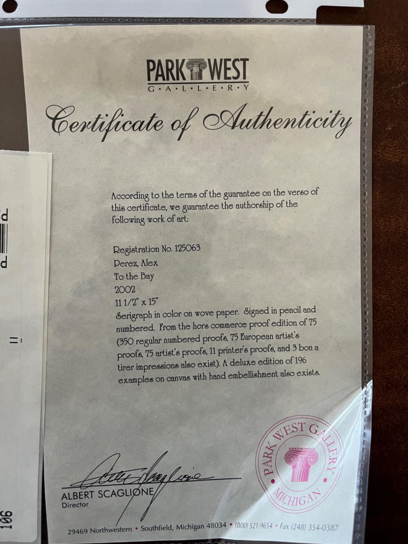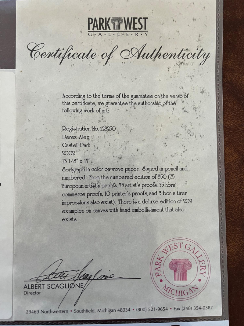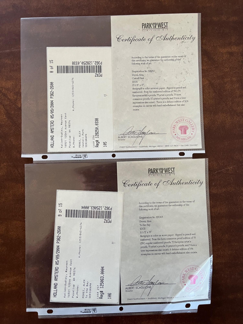 Unframed "Castell Park" & "To The Bay" by Alex Perez Serigraphs Both Serigraphs Are In Color On Woven Paper. Signed In Pencil & Numbered "To The Bay" 11.5" x 15" #'d 72/72 "Castell Park" 13" x 17" #'d 19/350 About The Artist: Born in Santiago, Chile, in 1946, Alex Perez is the fourth generation of Jewish artists. He studied painting in the Academy of Fine Arts in Santiago. After graduation, he worked in his father’s studio where he gained most of his artistic knowledge and technique. In 1964, he immigrated to Israel and settled in Kibbutz Ramat Yohanan.In 1968, after army service, he was accepted as a member of the Kibbutz Movement Artists Association. In addition to his painting, he divided his time between agricultural work in Kibbutz and teaching painting at the Regional School. Soon after, between 1974 and 1977, he devoted himself solely to painting in his studio. In 1977 he moved to Tel Aviv where he works and lives today.