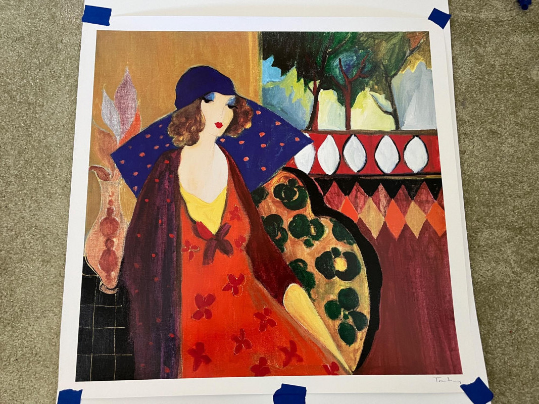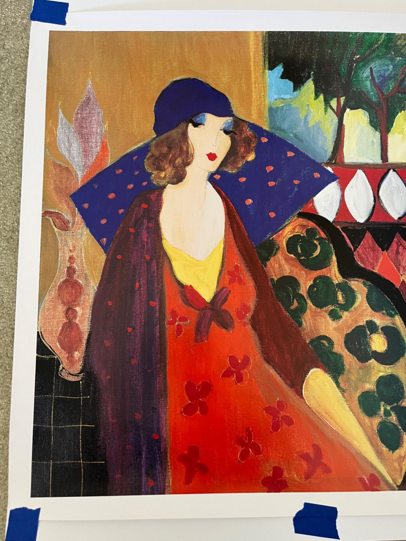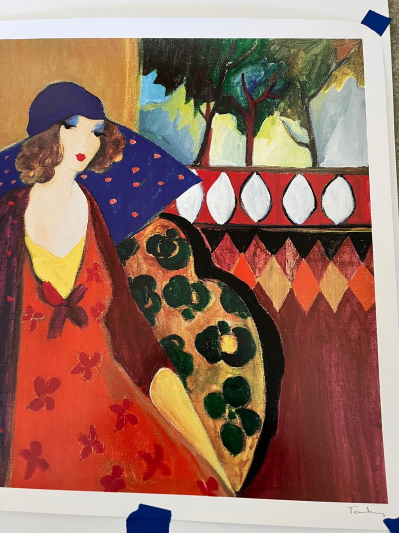 Unframed "Indigo Chapeau" by Itzchak Tarkay Seriolithograph Art Size: 25" x 25 3/8" In Color & Signed In Bottom Right Hand Corner About The Artist Itzchak Tarkay: Itzchak Tarkay was born in Subotica, on the Yugoslav-Hungarian border. At the age of 9, Tarkay and his family were sent to the Mauthausen concentration camp by the Nazis until Allied liberation freed them a year later.[citation needed]In 1949, his family immigrated to Israel and was sent to the transit camp for new arrivals at Be'er Ya'akov. They lived in a kibbutz for several years. In 1951 Tarkay received a scholarship to the Avni Institute of Art and Design,[4] where he studied under the artist Schwartzman and was mentored by important Israeli artists of the time. Tarkay worked in acrylic and watercolor. He was also a graphic artist and his rich tapestry of form and color was achieved primarily through the use of the serigraph. In his serigraphs, many colors are laid over one another and used to create texture and transparency. In his later years, Tarkay mentored younger Israeli artists including David Najar, Yuval Wolfson and Mark Kanovich who often visited his studio, worked alongside him and received his critiques. Tarkay was also the only artist to collaborate with Yaacov Agam (1928). He and Agam created two paintings which incorporated both artists' imagery in a single painting.