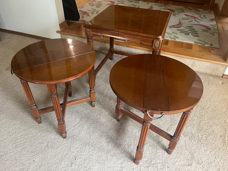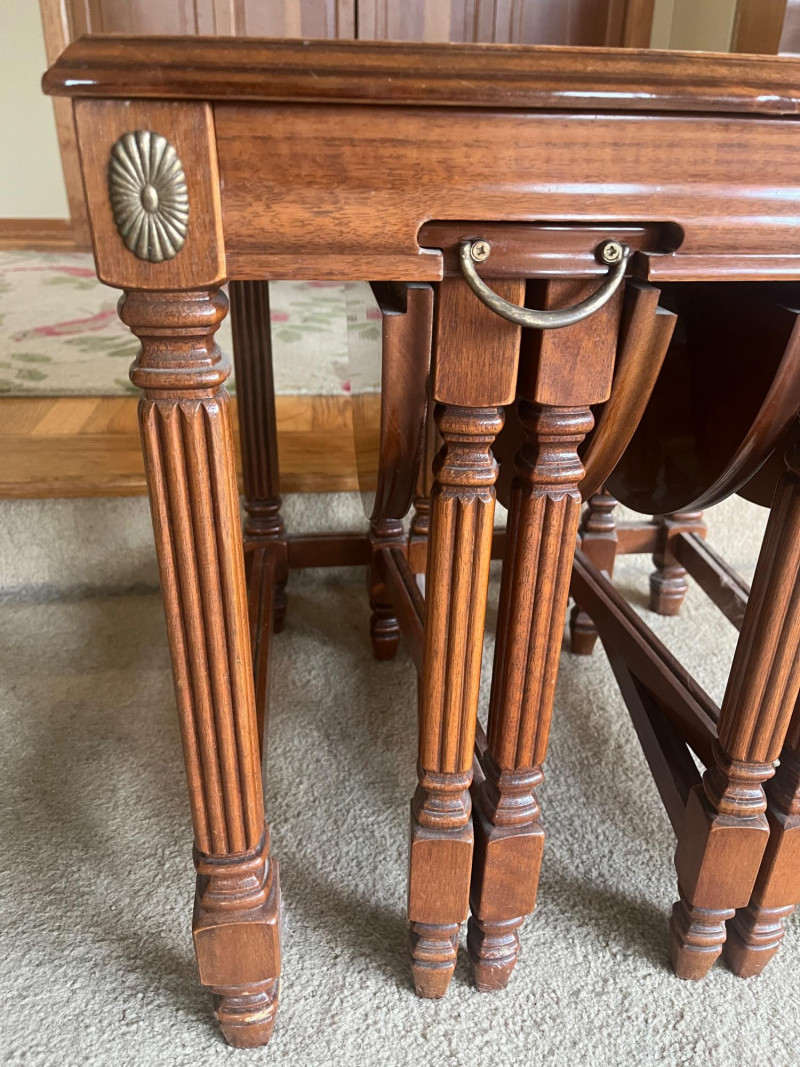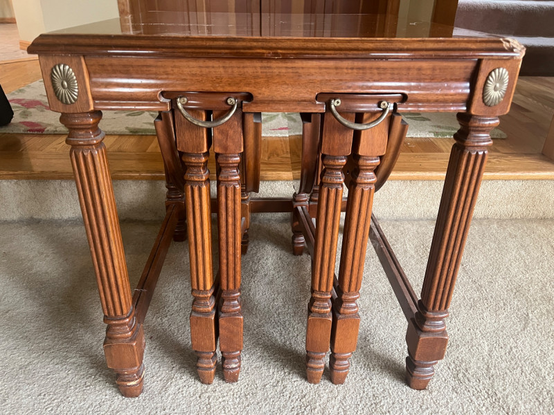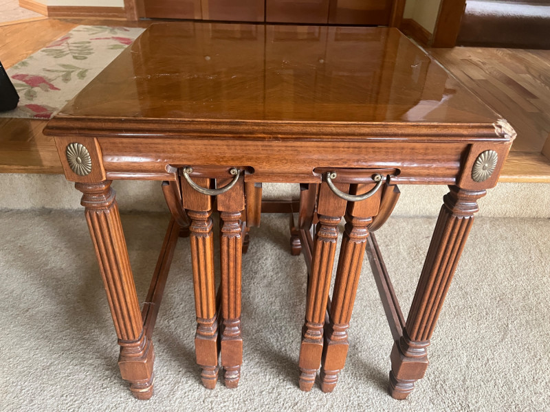 Gorgeous Vintage Nesting Table Table Dimensions: 20x20x21H 2 Smaller Tables Fit Inide Dimensions Of Larger Table See corner damage on side
