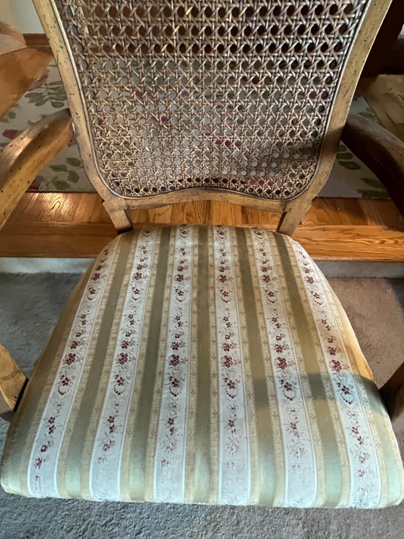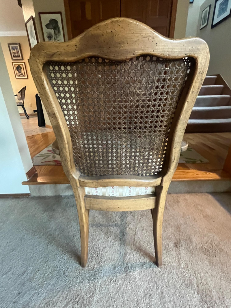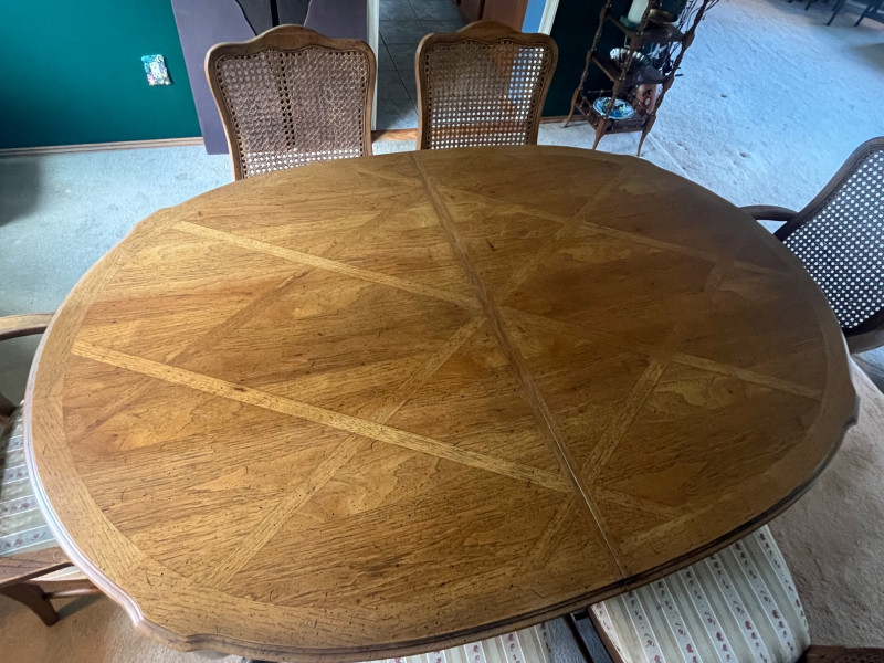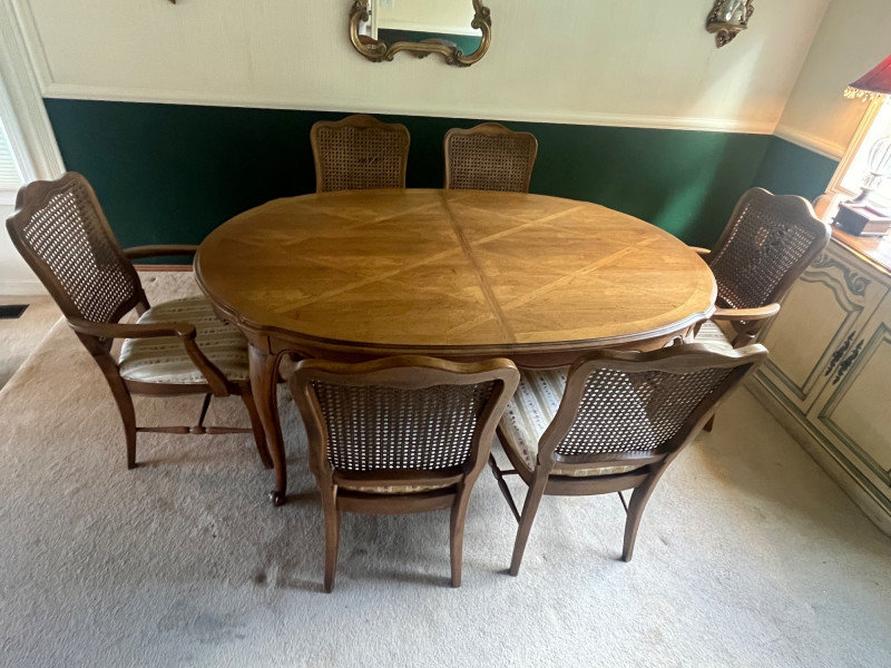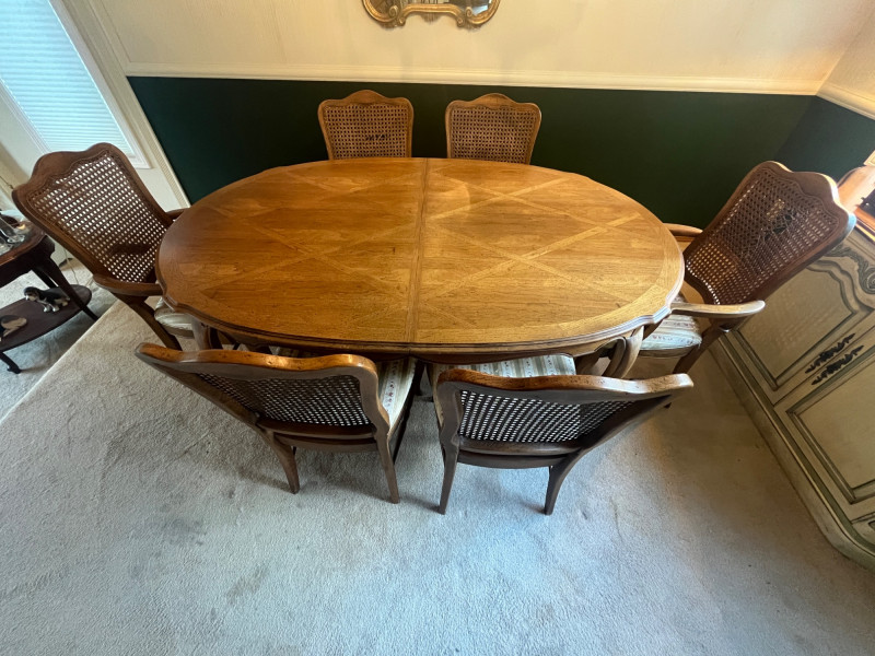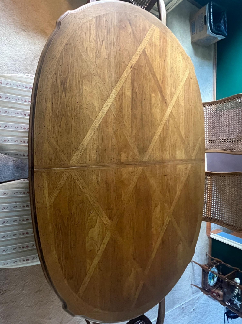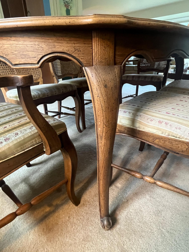 Vintage Formal Extendable Dining Table Believe The Maker Is "Baker Furniture" 65x43x29" H Table Also Has Inserts For Extension & Table Pads 4 Chairs Great Condition, 1 w/ Small Puncture Hole On Cane, 1 w/ Significant Damage On Cane