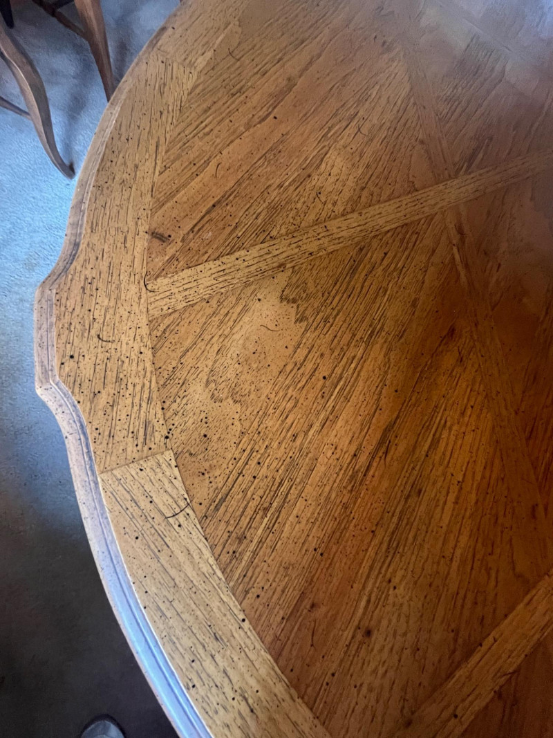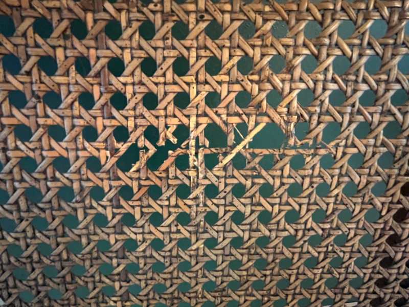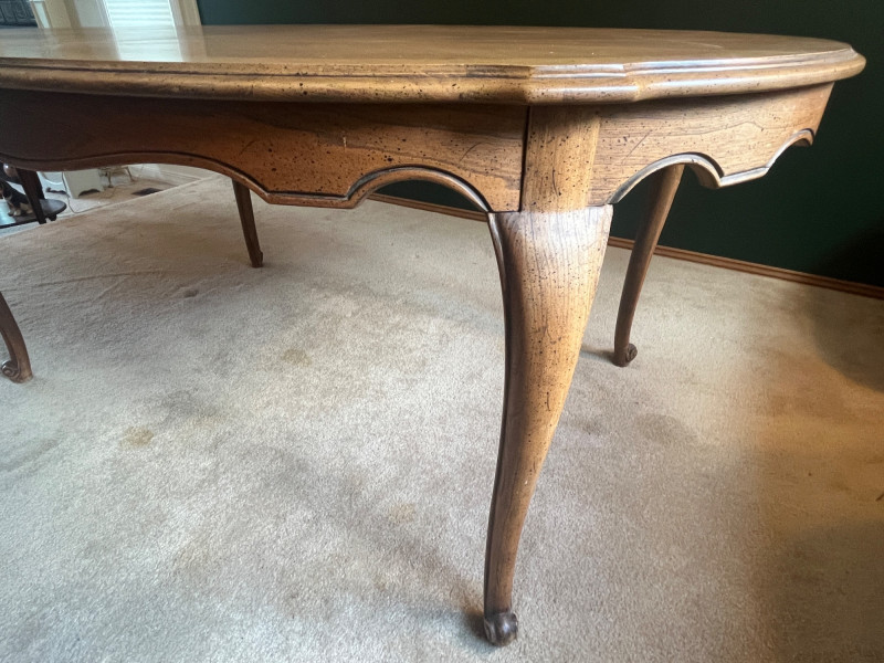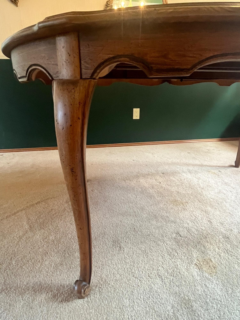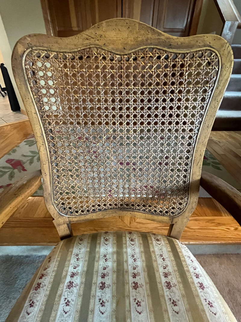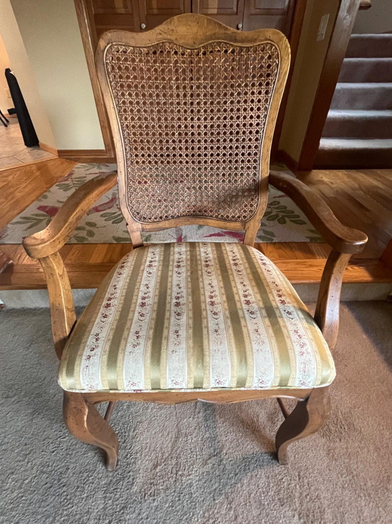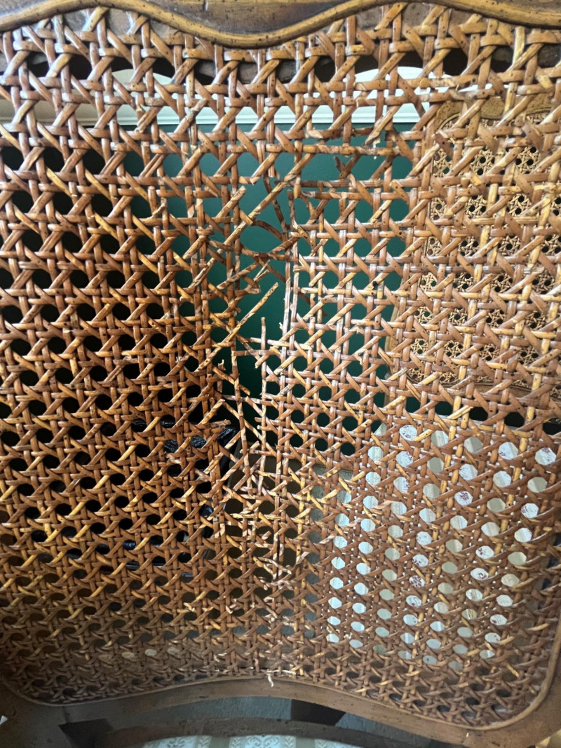 Vintage Formal Extendable Dining Table Believe The Maker Is "Baker Furniture" 65x43x29" H Table Also Has Inserts For Extension & Table Pads 4 Chairs Great Condition, 1 w/ Small Puncture Hole On Cane, 1 w/ Significant Damage On Cane