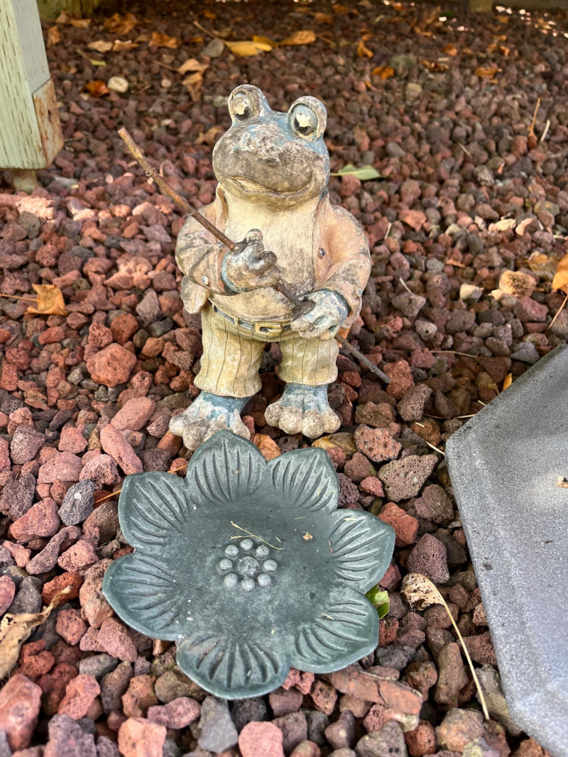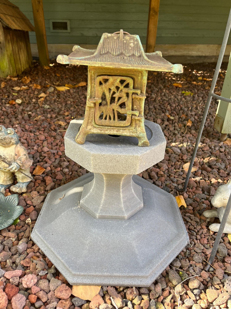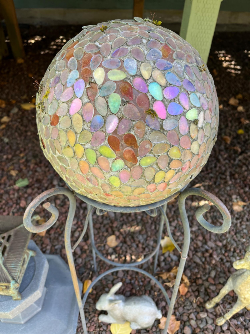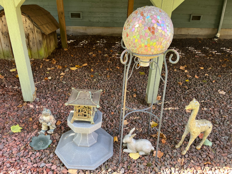Lot Includes: Gazing Ball, Rabbit, Giraffe, Fishing Frog, & Pagoda