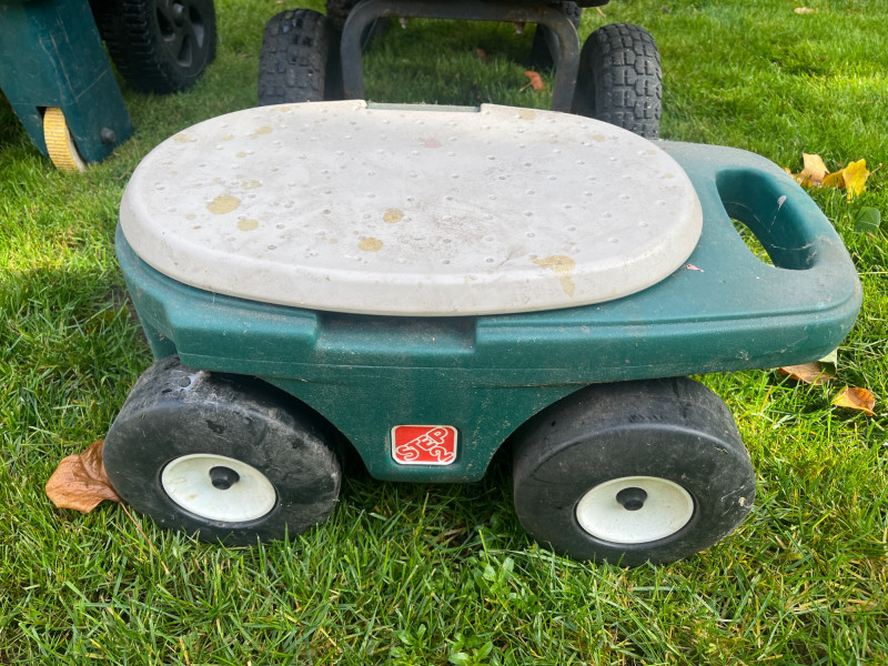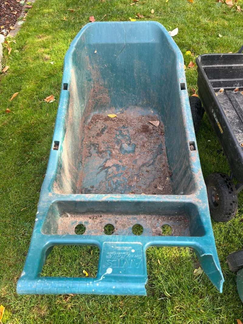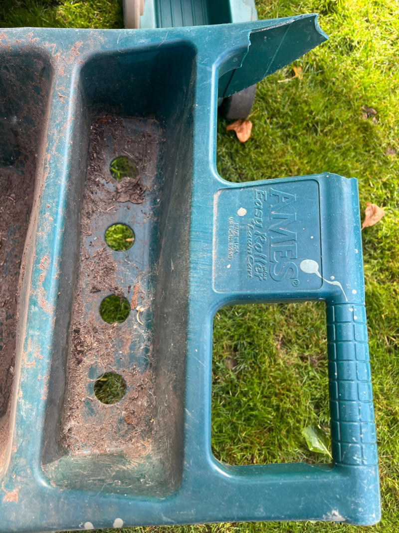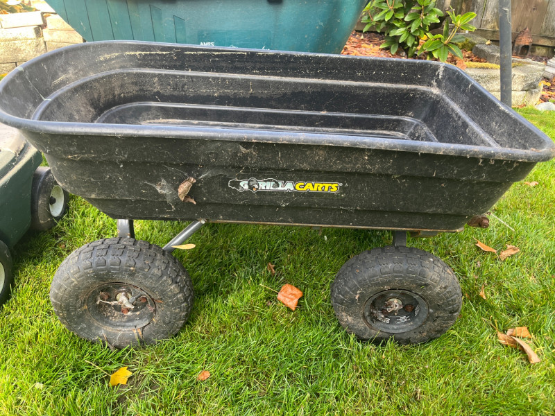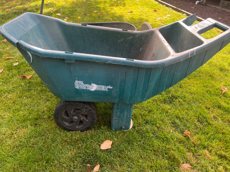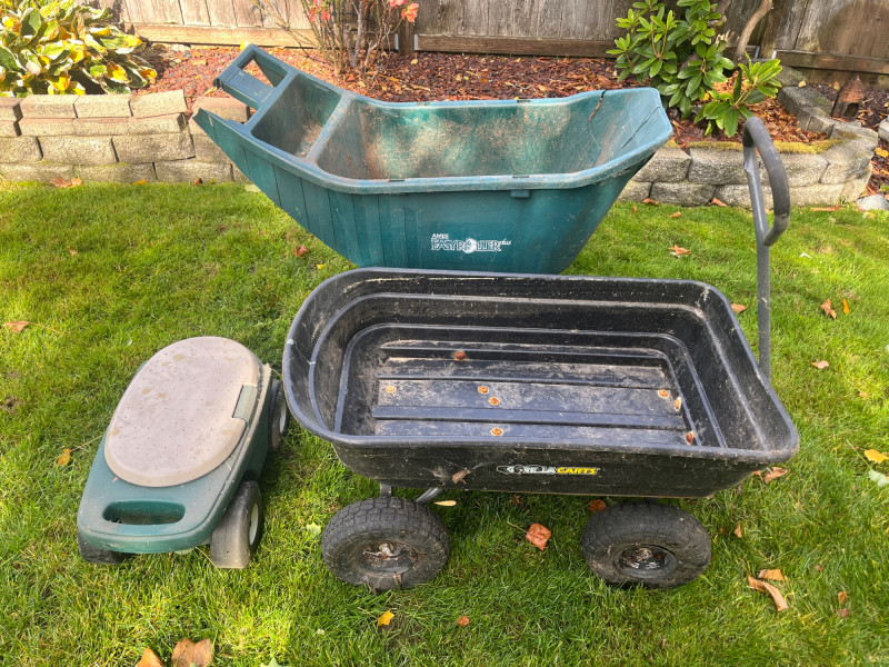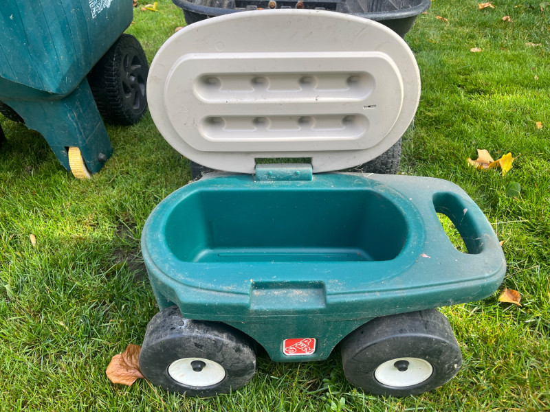Waste Bins & Garden Caddy (3 Total) Garden Caddy Good Condition Black Compost Wagon (Needs Tires) Green Plastic Wagon w/ Missing/Cracked Handle