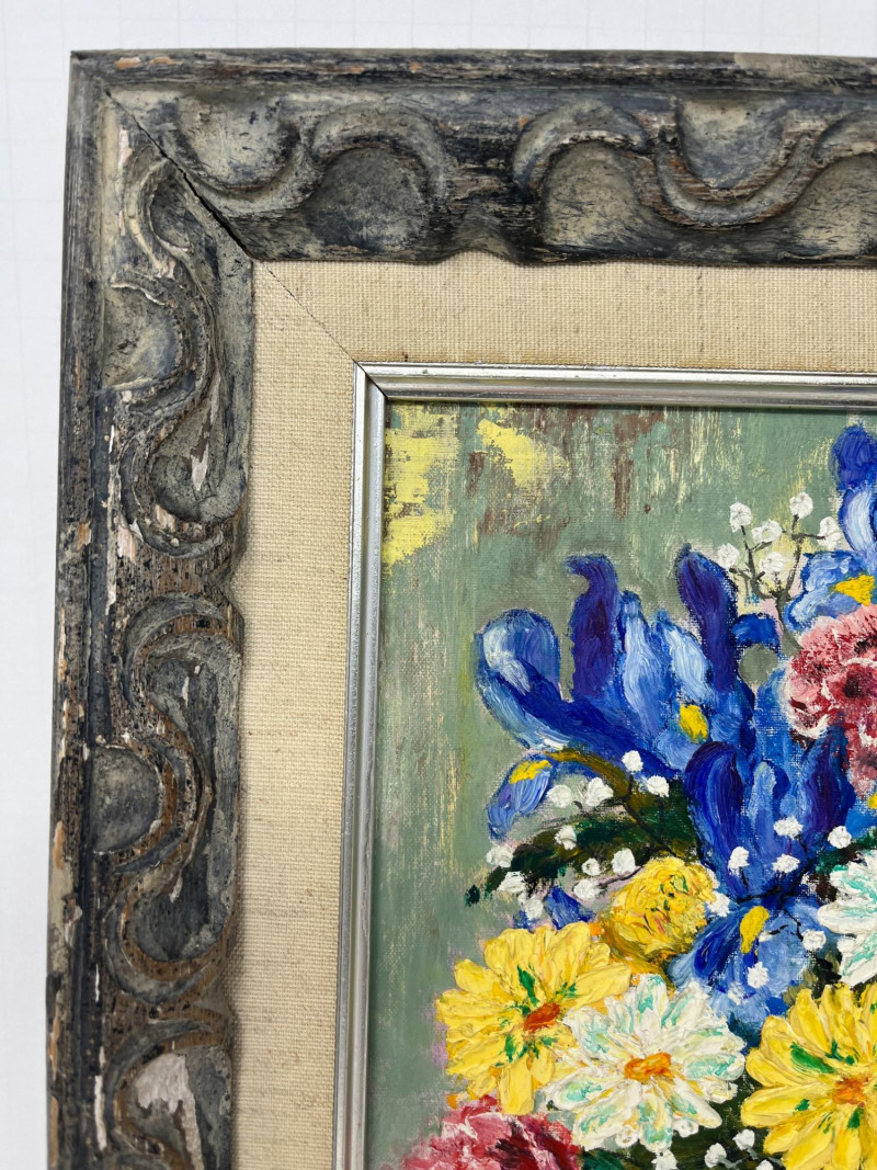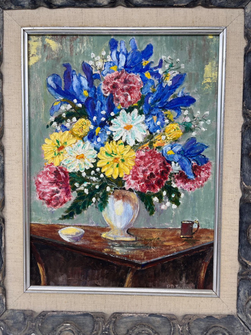P.D. Jacobs Original "Floral" Artwork Frame Dimensions: 17 x 14 Canvas Dimensions: 9 x 12 P.D. Jacobs (Artist related to owner of estate) Died Mid 1950's shortly after painting. Ornate Wooden Frame