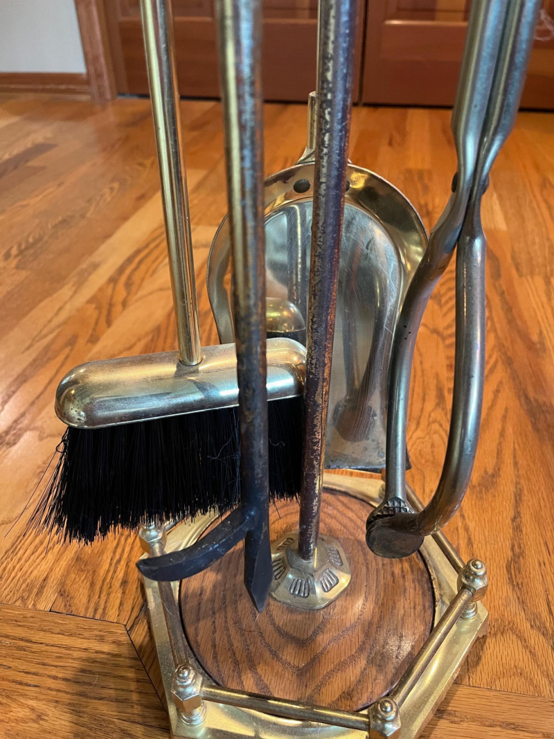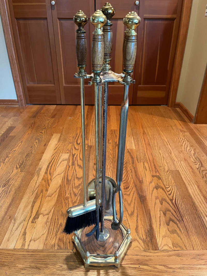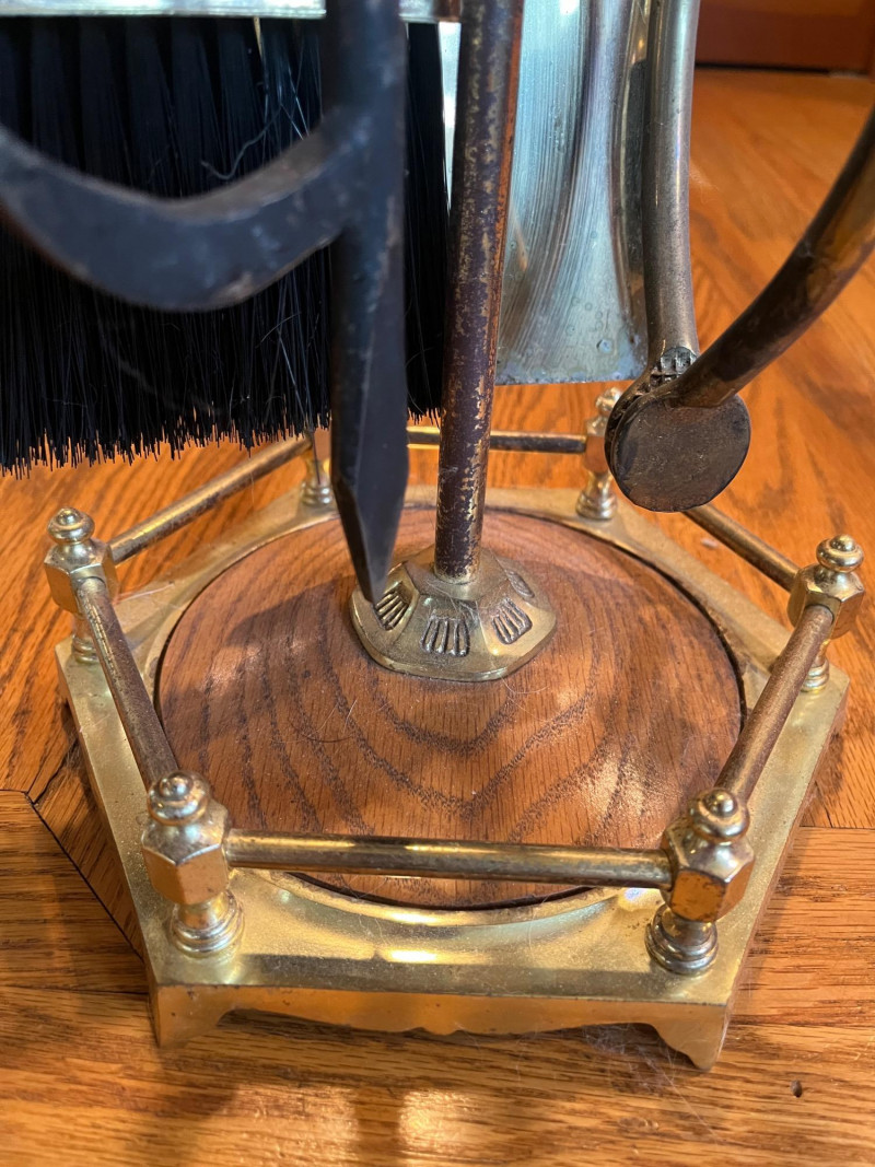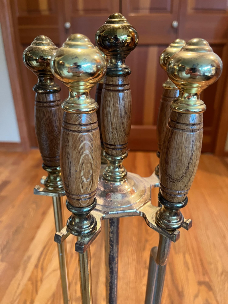 Vinatage Fire Place Tool Set Gold Finish w/ Wooden Handles & Base Set Includes Poker, Tongs, Brush, Shovel