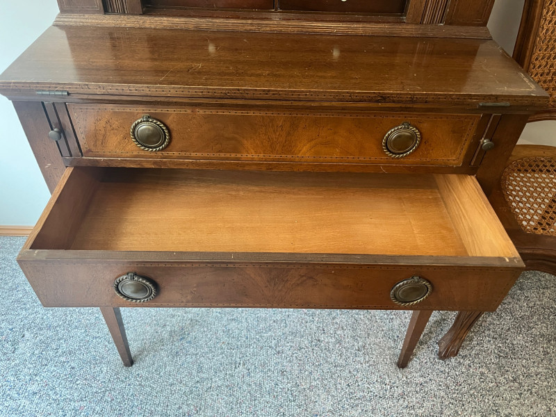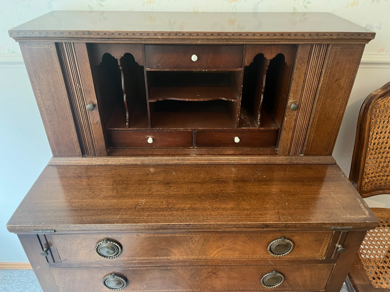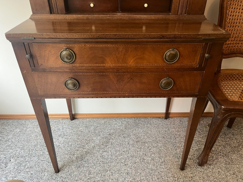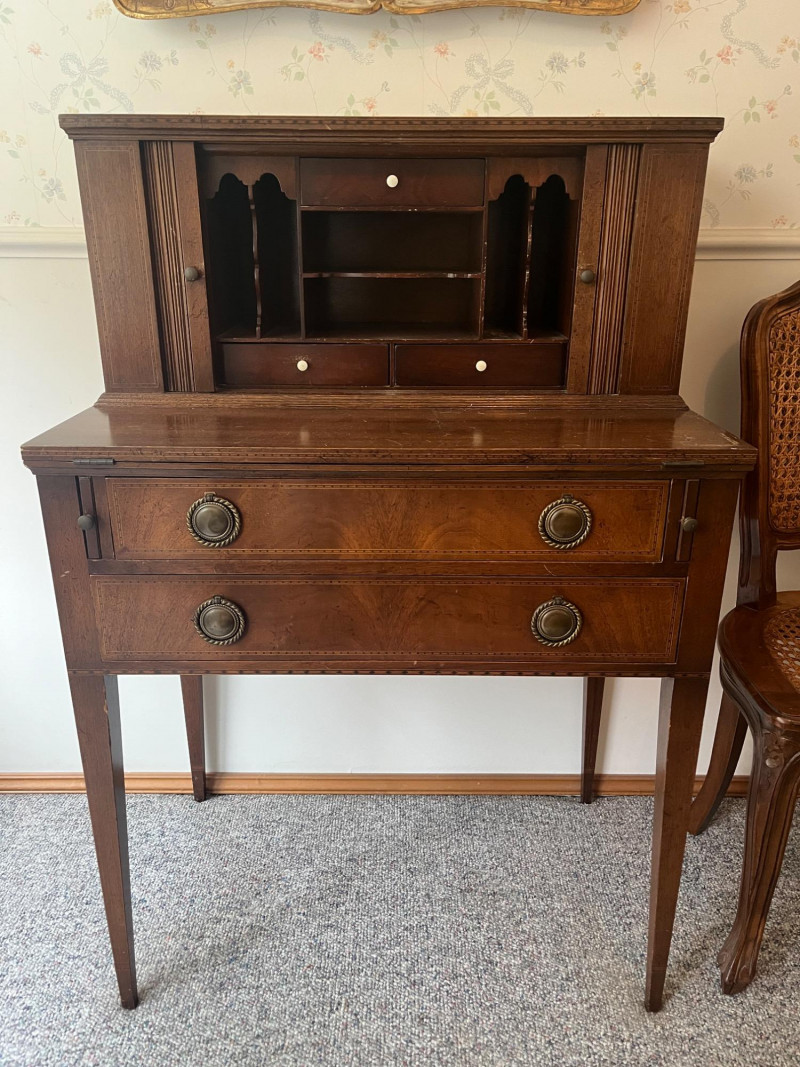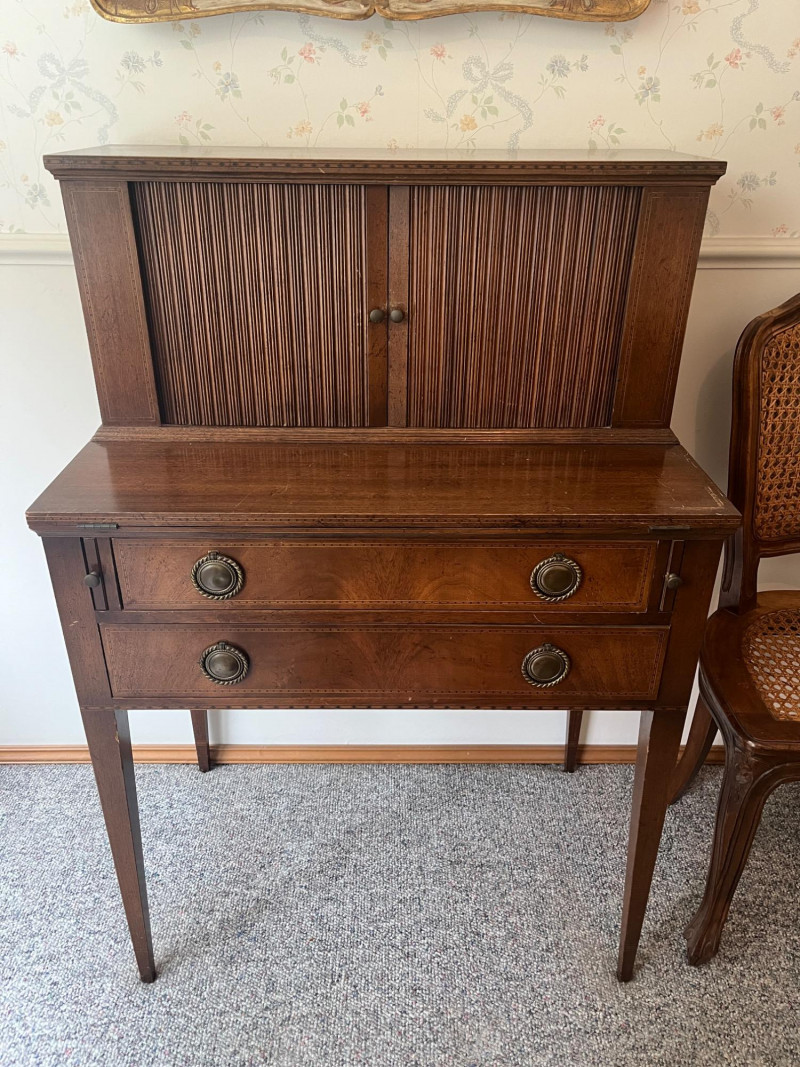 Early 20th Century Hepplewhite Style Mahogany Inlaid Secretary Writing Tambour Desk Stunning!! Ornate Drawer Pulls & Intricate Design Minimal Wear Antique Desk: 41 x 28 x 17 Cane Back Chair Also Included w/ Desk