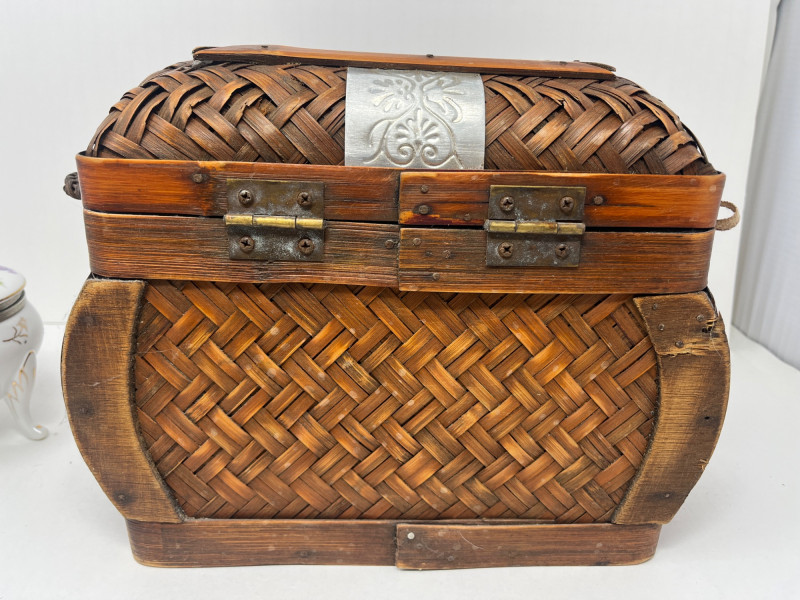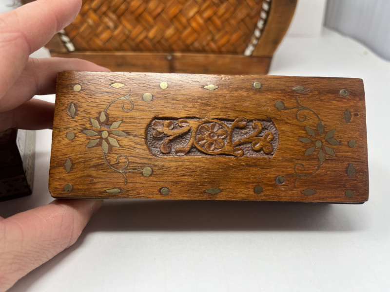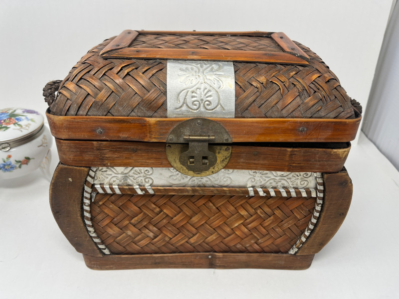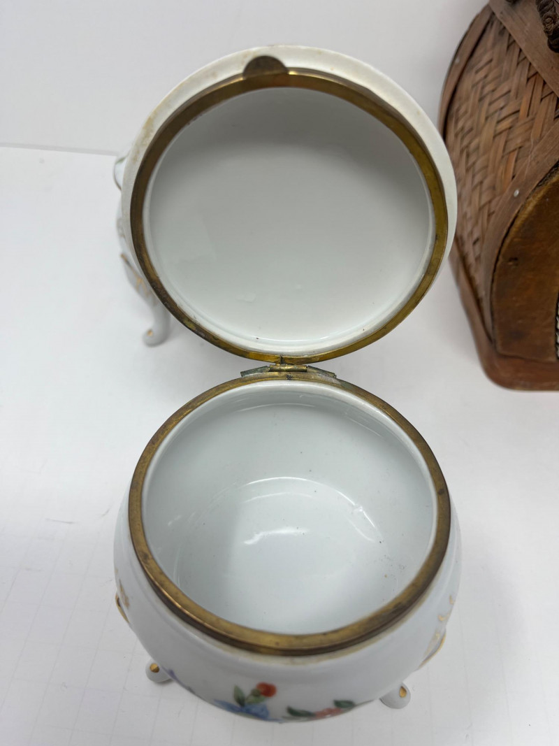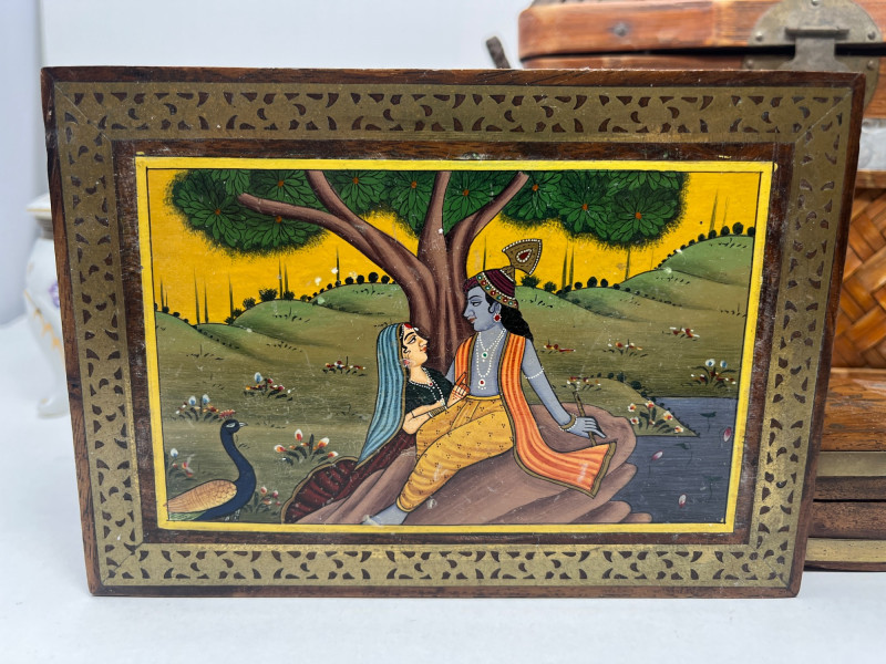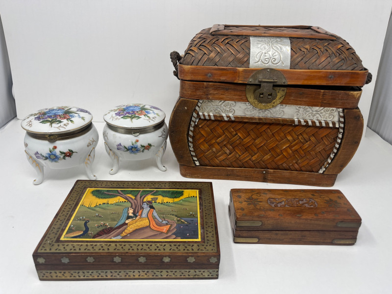6 Piece Collectible Lot Includes: Porcelain Trinket Boxes, Wicker Basket, Wooden Trinket Box, Small Hindu Painting