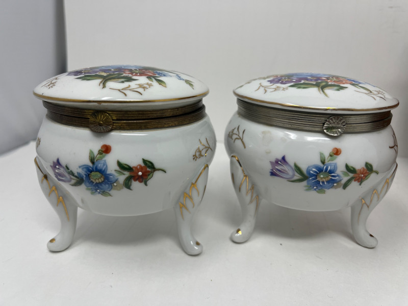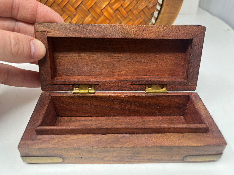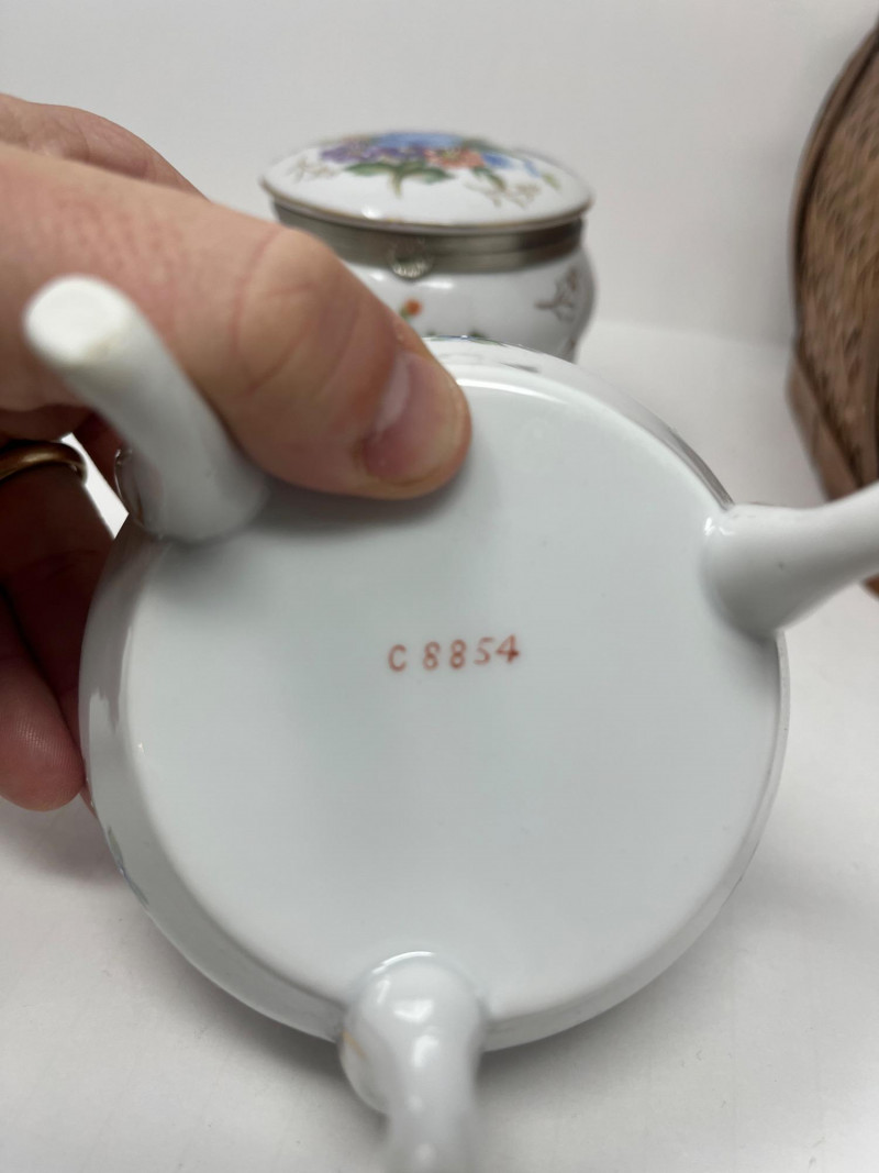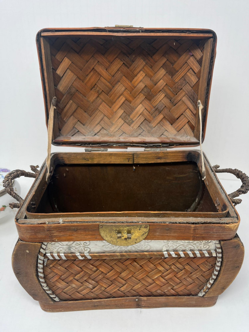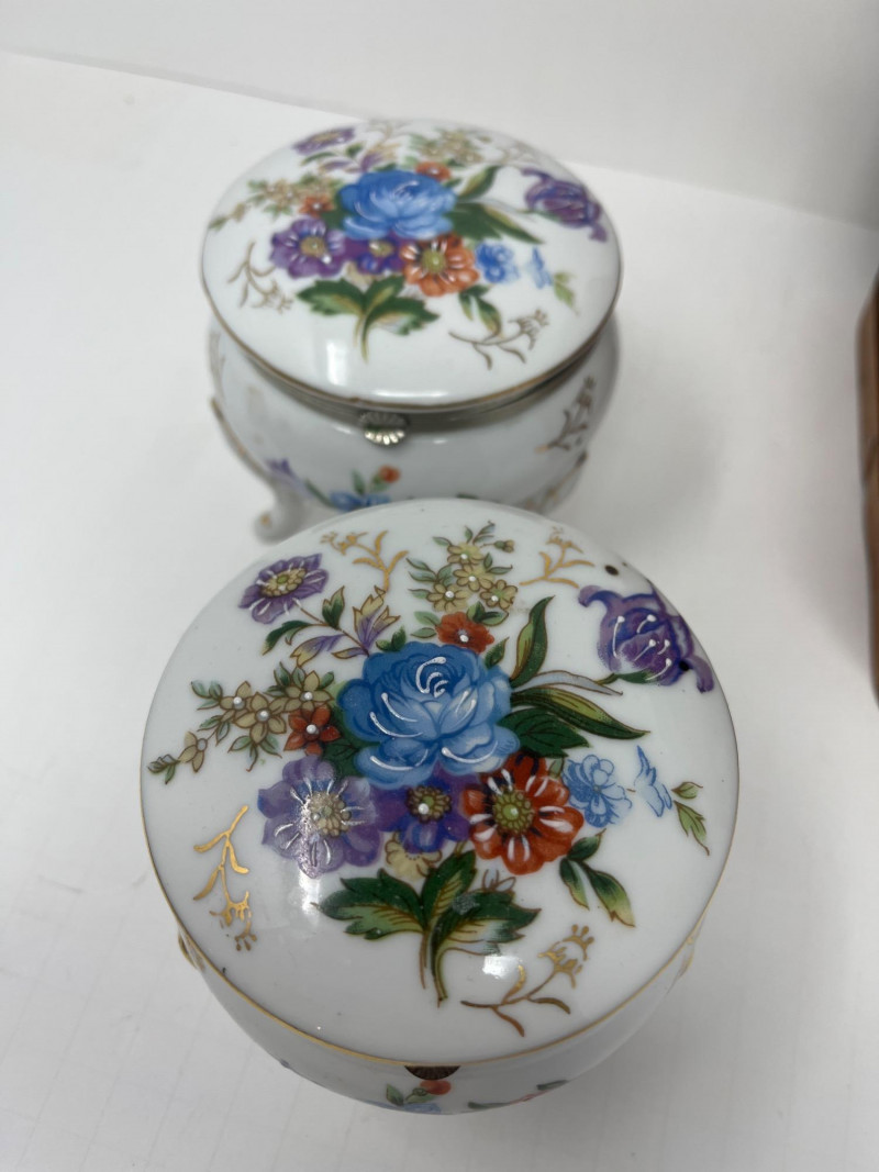 6 Piece Collectible Lot Includes: Porcelain Trinket Boxes, Wicker Basket, Wooden Trinket Box, Small Hindu Painting
