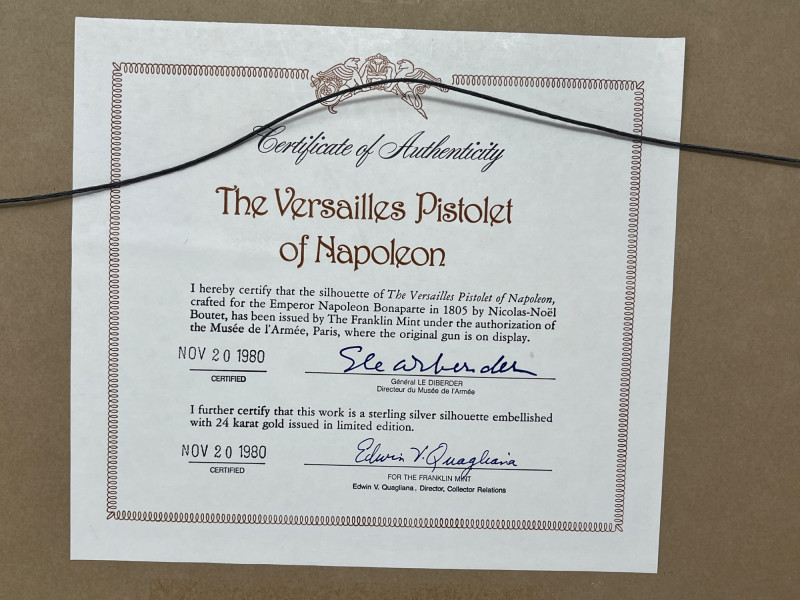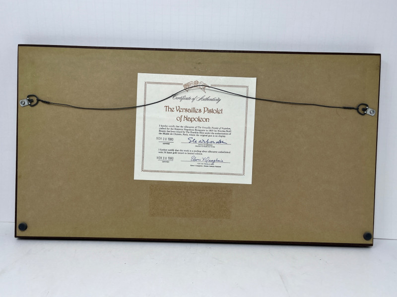 The back has the Certificate of Authenticity that reads:"The Versailles Pistolet of Napoleon I hereby certify that the silhouette of The Versailles Pistolet of Napoleon, crafted for the Emperor Napoleon Bonaparte in 1805 by Nicolas-Noel Boutet, issued by the Franklin Mint under the authorization of the Musee de l'Armee, Paris, where the original gun is on display." Certified Nov. 20, 1980, signed General Le Diberder, Director du Musee de l'Armee"I further certify that this work is a sterling silver silhouette embellished with 24 karat gold issued in limited edition. Certified Sept 1, 1980, signed William F. Krueger , Vice President, Collector Relations, comes in a 21 5/8 x 11 ¾ inch wood frame. No scuff marks or damage to frame , artwork or glass. Excellent condition!