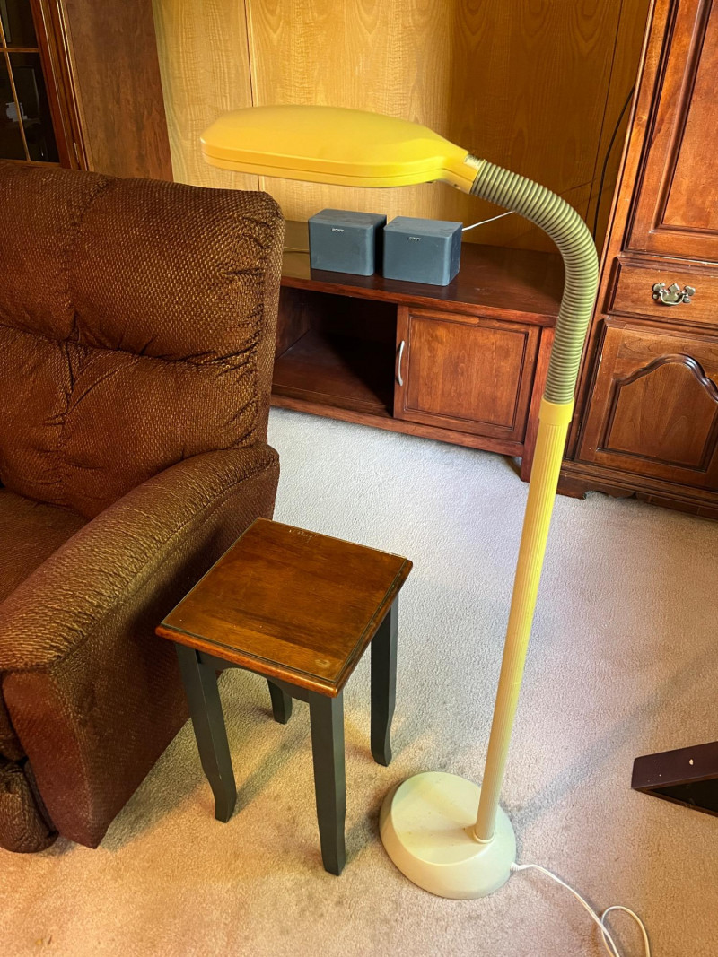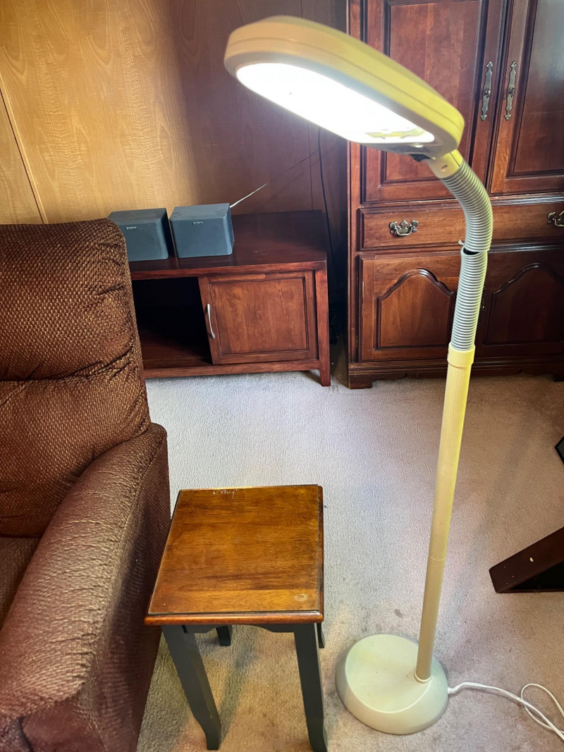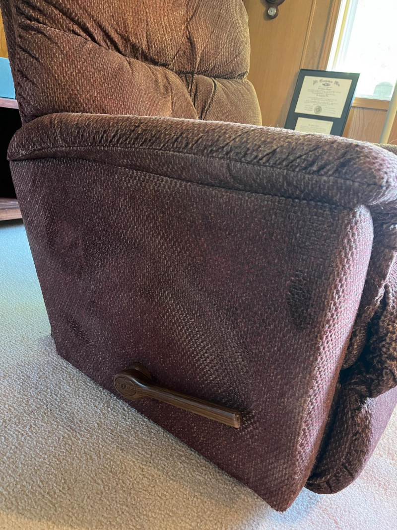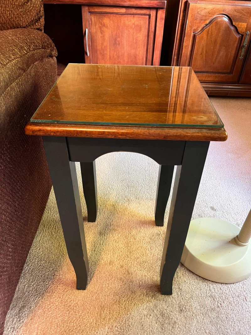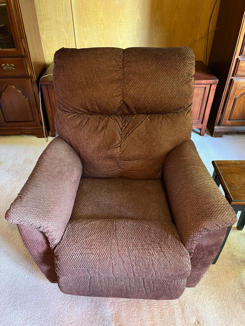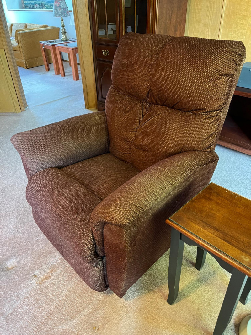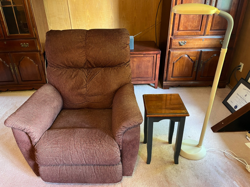 Recliner, End Table, Lamp Lot Includes: Recliner From Smoke Free Home. Recliner Operates As Normal Small Square Glass Top End Table Floor Light Tested & Working. See Small Rip In Plastic On Neck Of Light