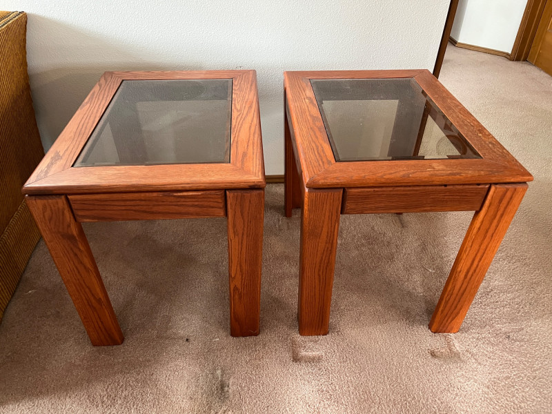 End Tables w/ 2 Lamps Lot Includes Pair Of Matching Hardwood End Tables w/ Glass Top 24 x 18 x 20 2 Ornate Lamps Porcelain & Brass Lamp