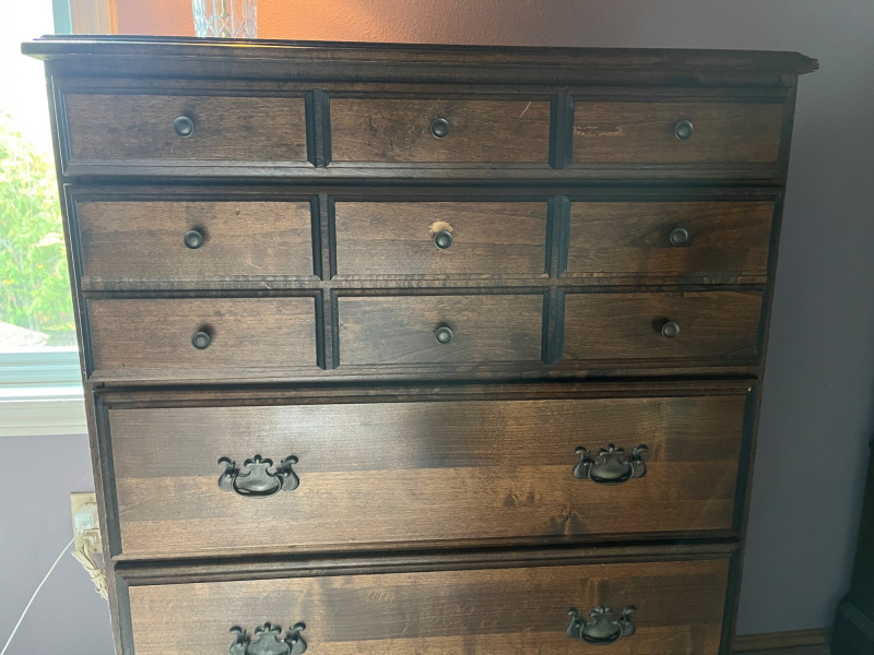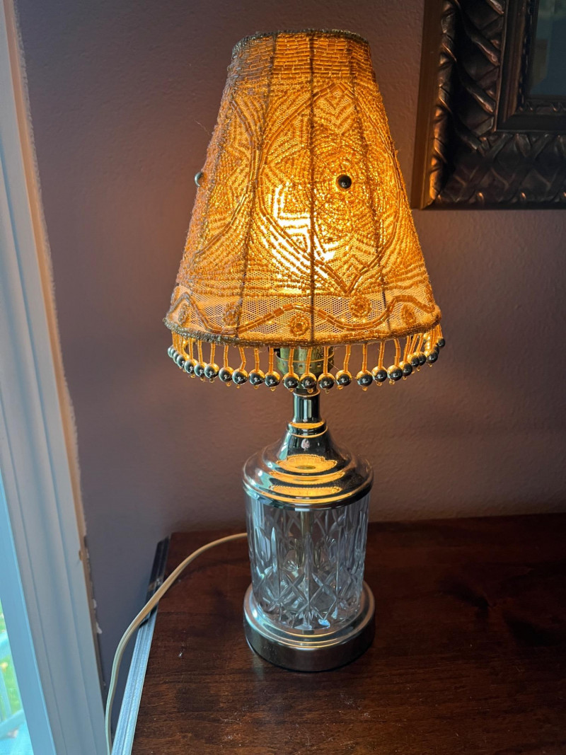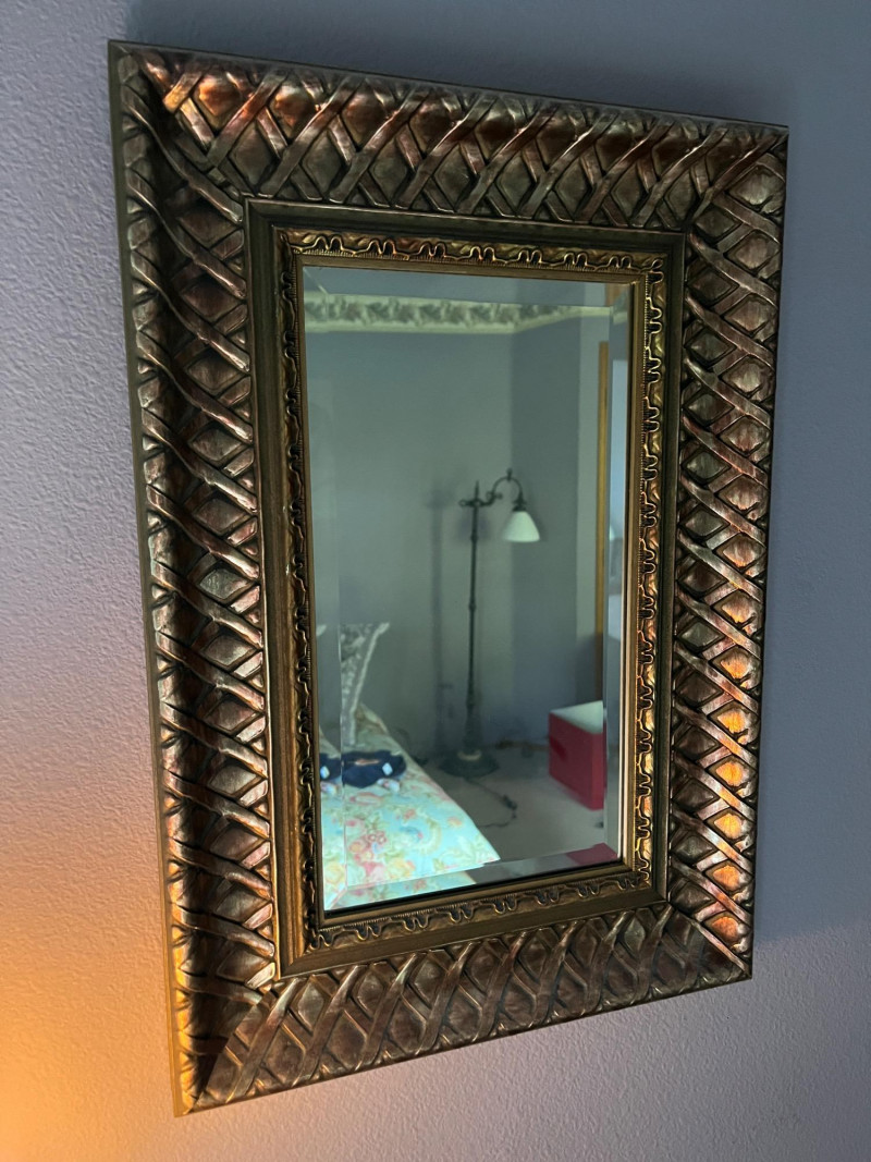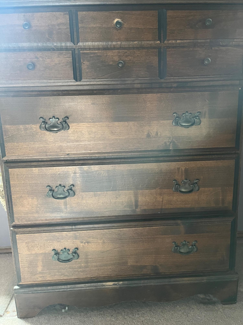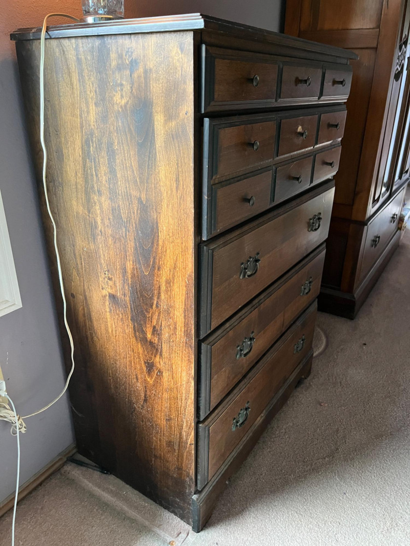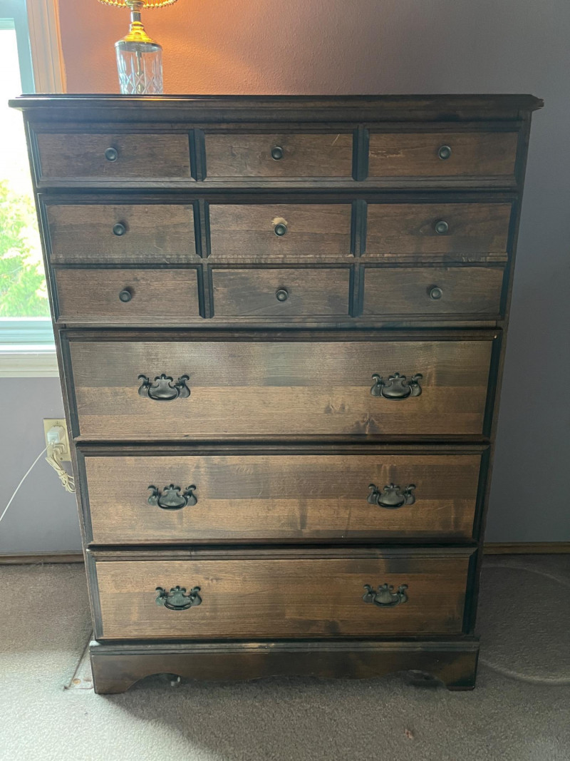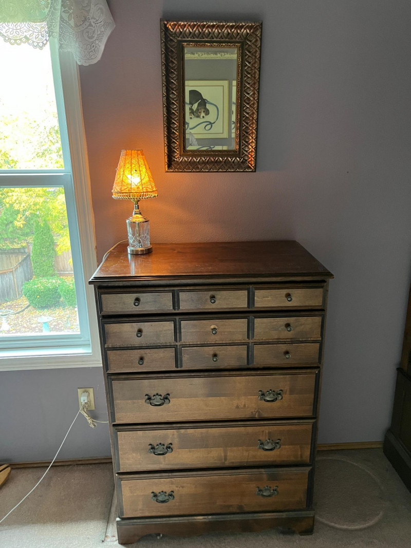 Solid Wood Dresser, Lamp, Ornate Mirror Lot Includes: Solid Wood Dresser Dark Stain 30 x 17 x 42 Cut Glass Lamp 15"H Ornate Mirror 14 x 20