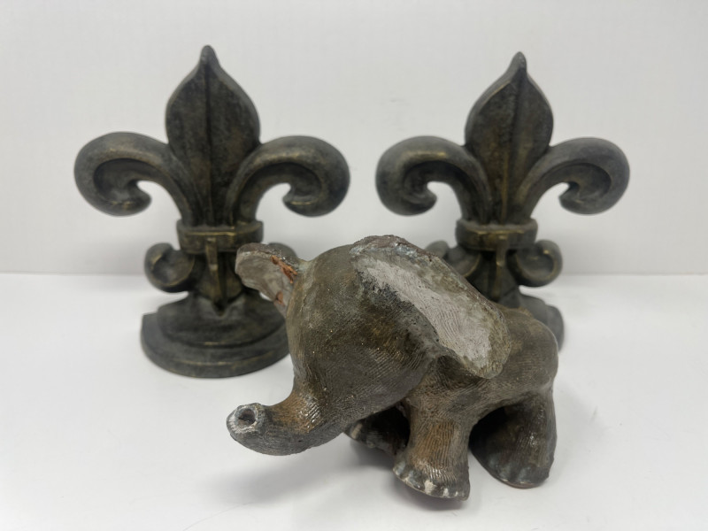 Fleur De Les Bookends & Elephant Bookend Cast Iron Fleur De Les Bookends Elephant Figurine (Used As Bookend) 3 Total Pieces