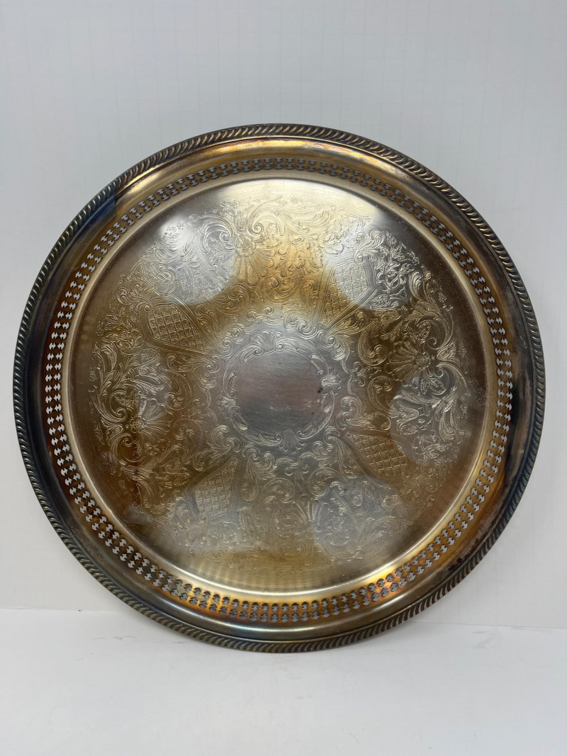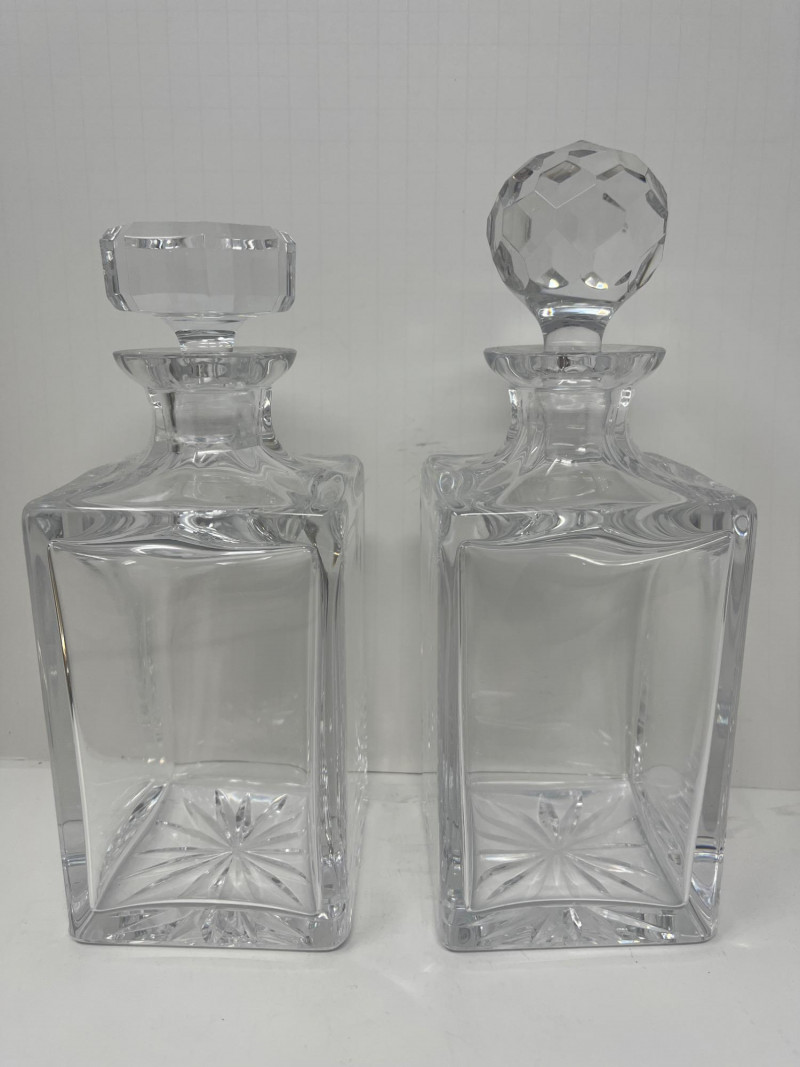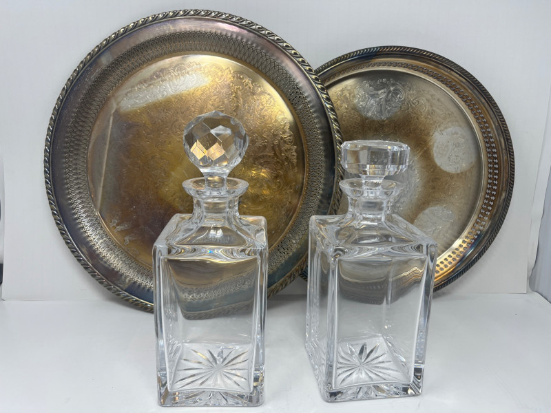2 Crystal Decanters, Silver Plated Trays, Vintage Gin Bottle