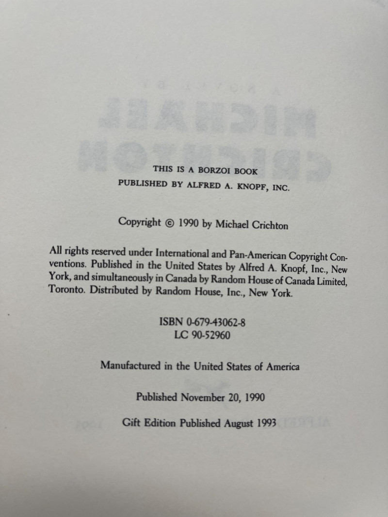 Lot # 15 - RARE Signed "Jurrasic Park" Book by Michael Crichton