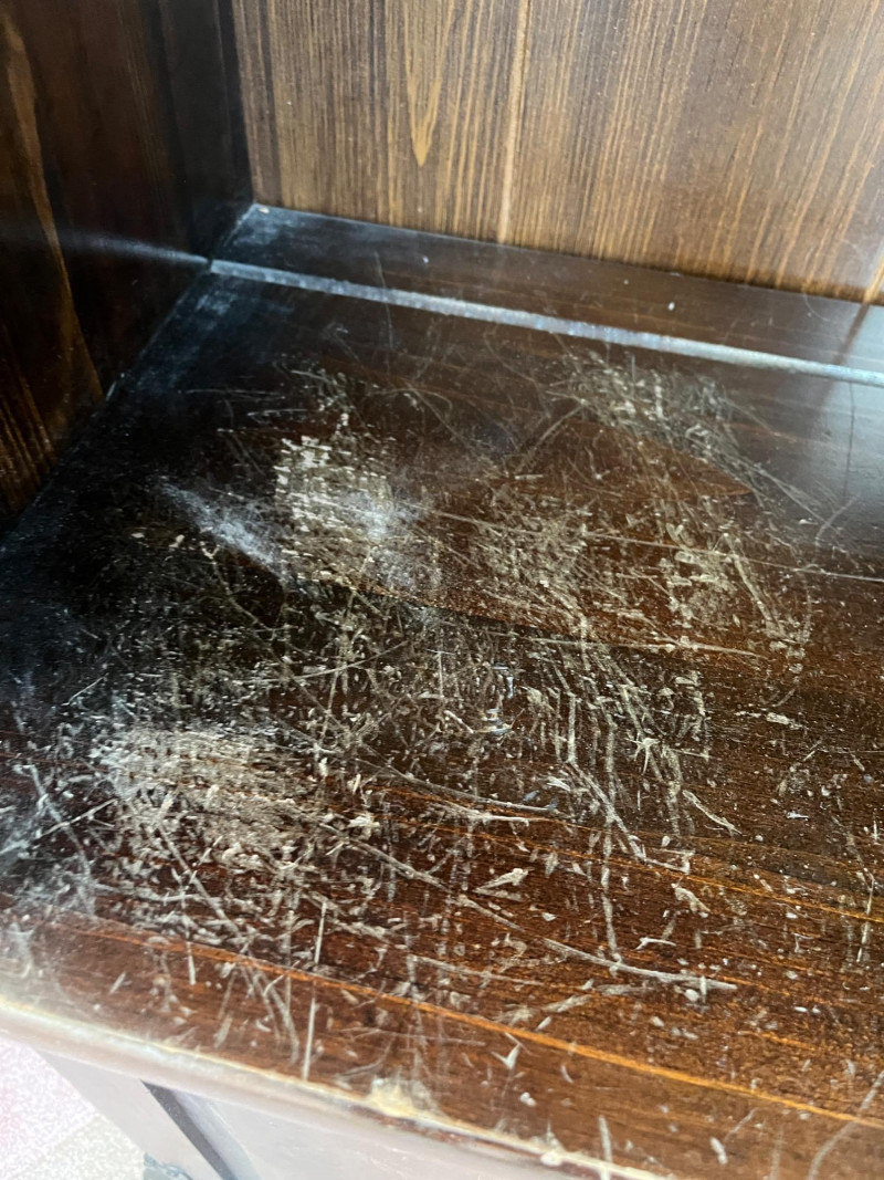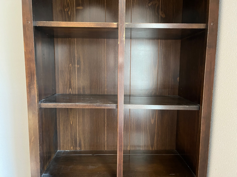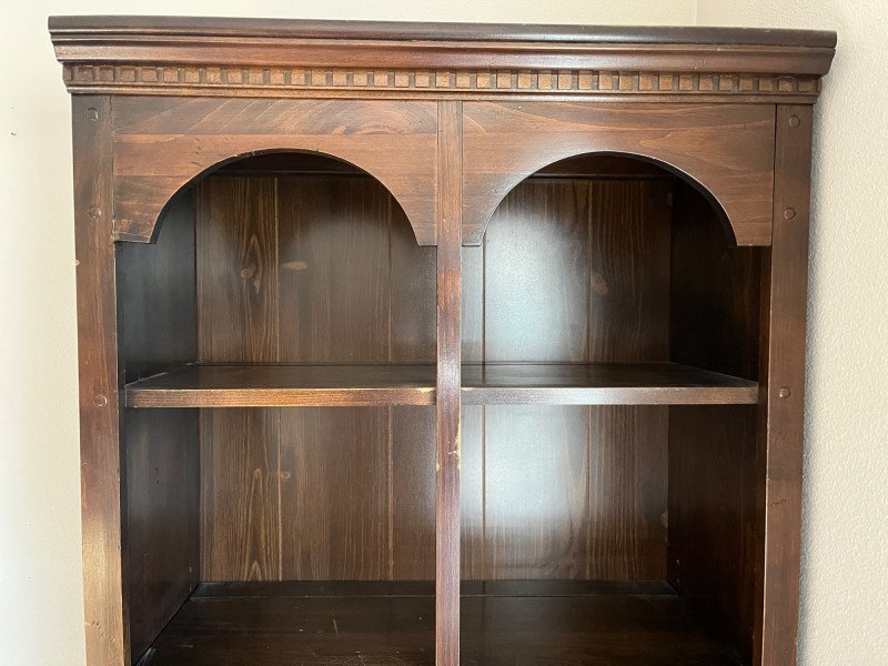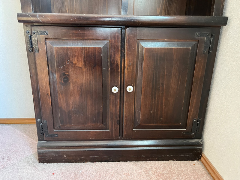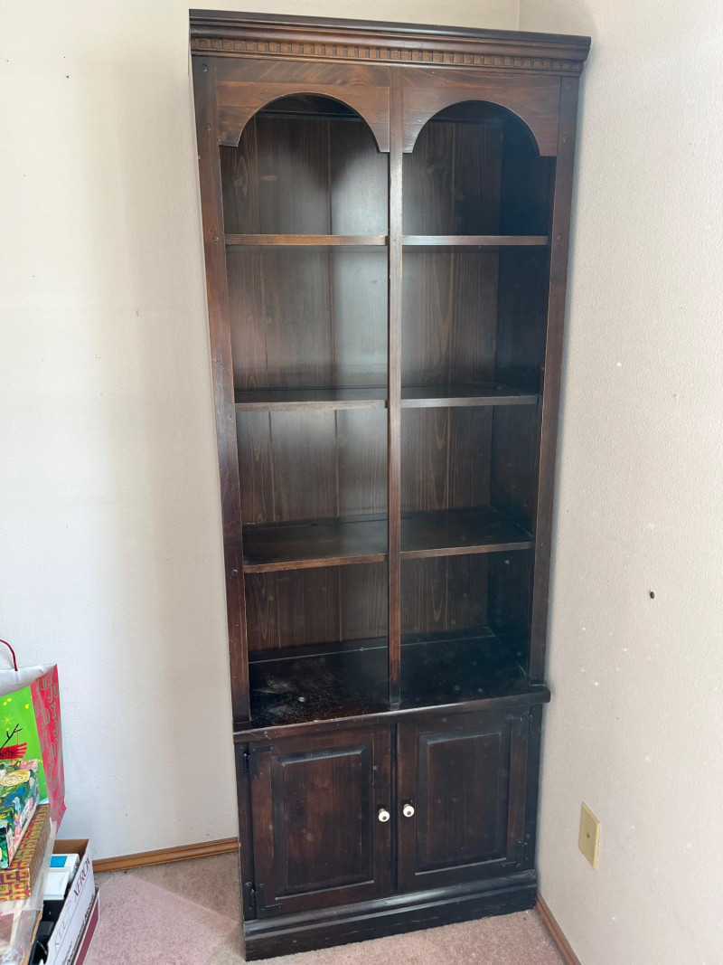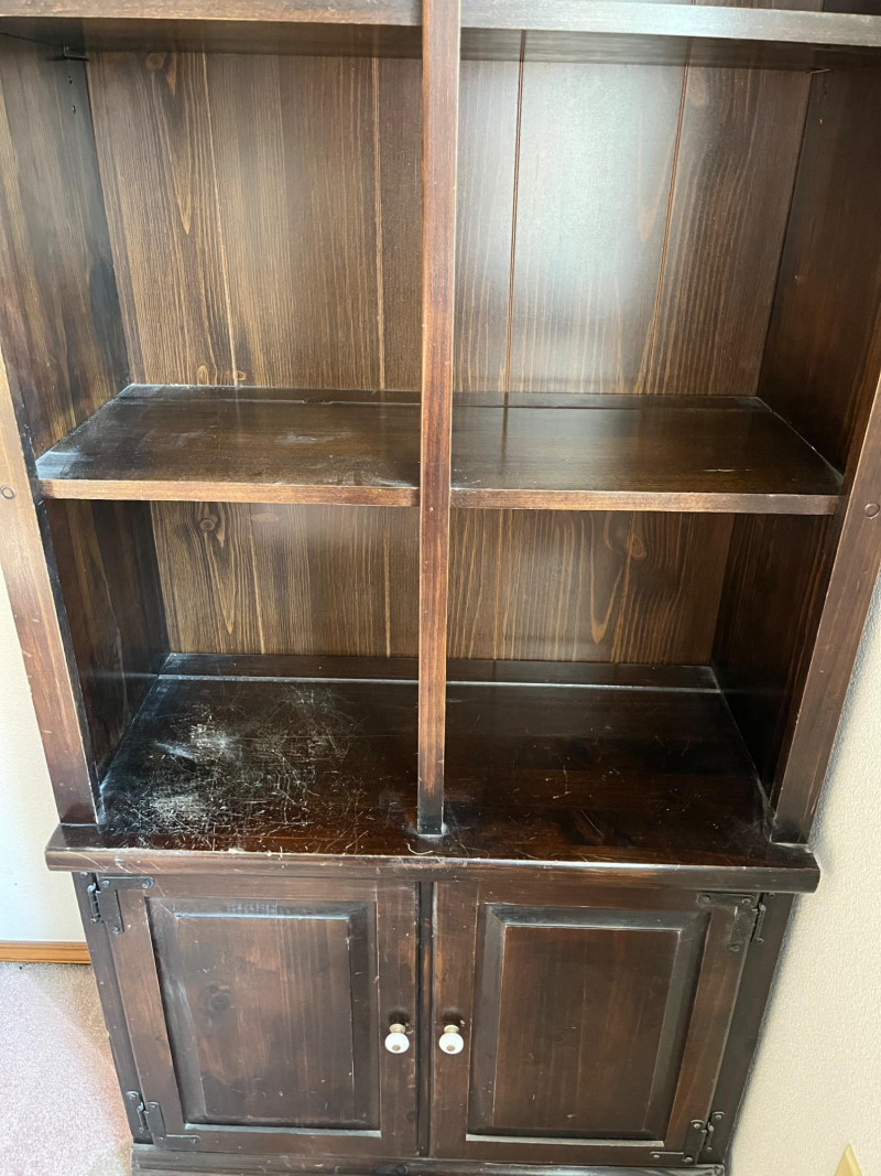 Dark Wood Solid Bookcase 76 x 28 x 13 4 Tier Shelf/2 Door Cabinet Down Below See HEavy Scratches On Lowest Shelf. Minor Scratches Wear Elsewhere