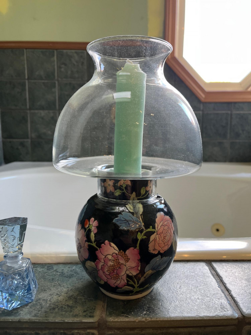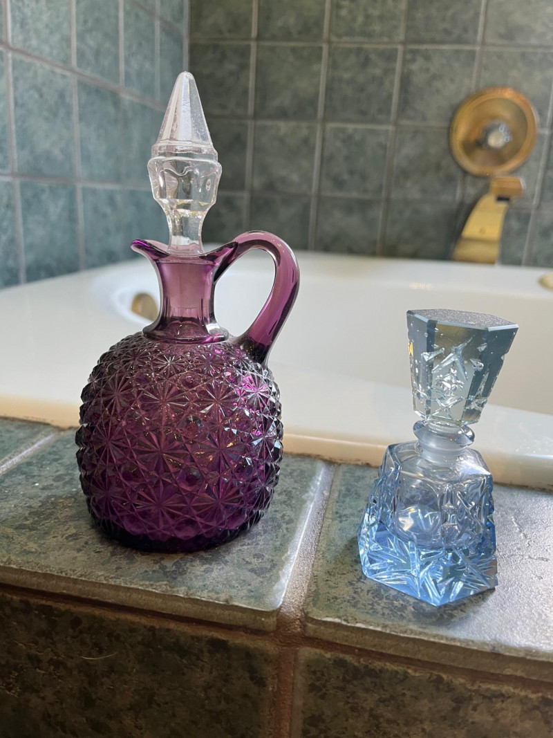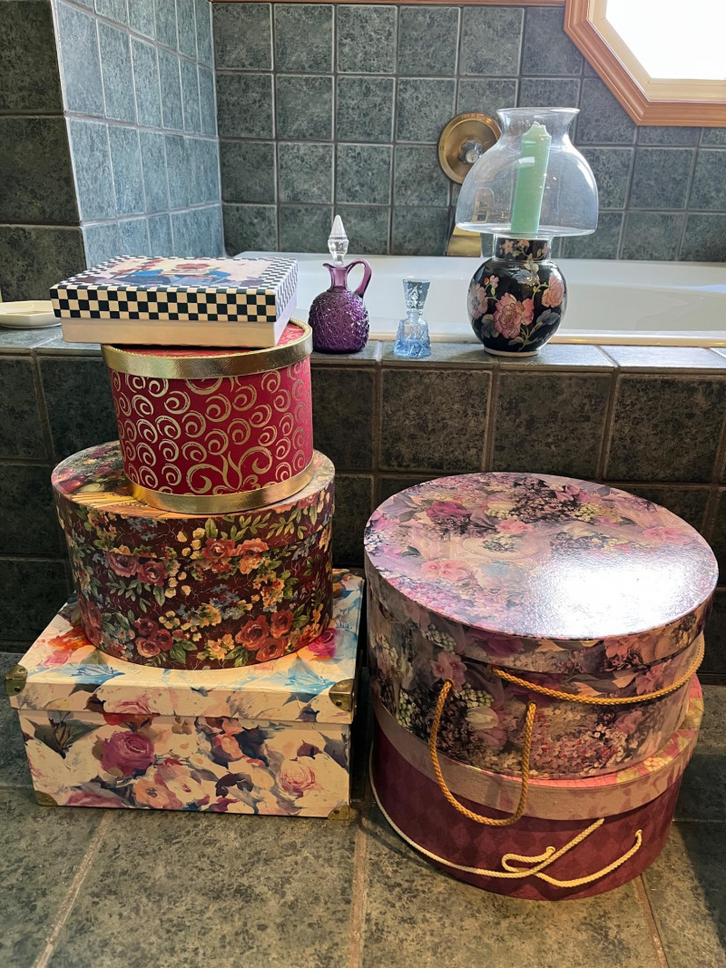 Decorative Hat Boxes Plus Colored Glass Cruets 6 Decorative Hat Boxes Vintage Hurricane Candle Lamp Vintage Colored Glass Cruets (Purple & Light Blue)