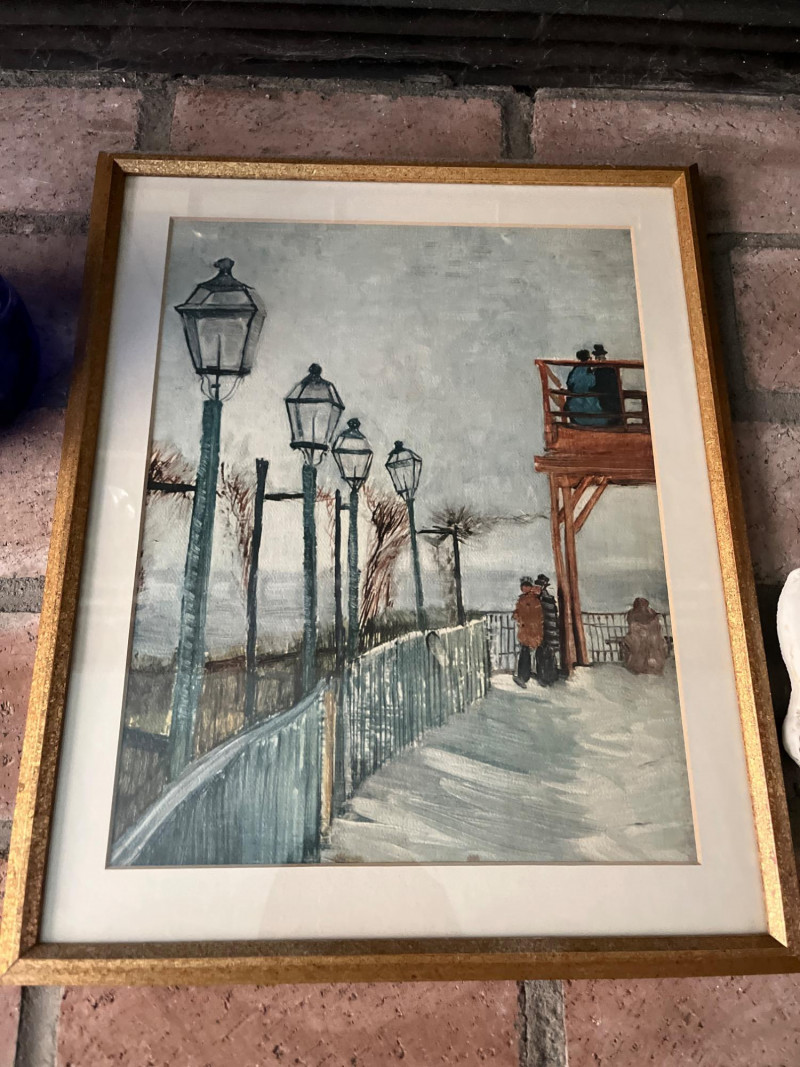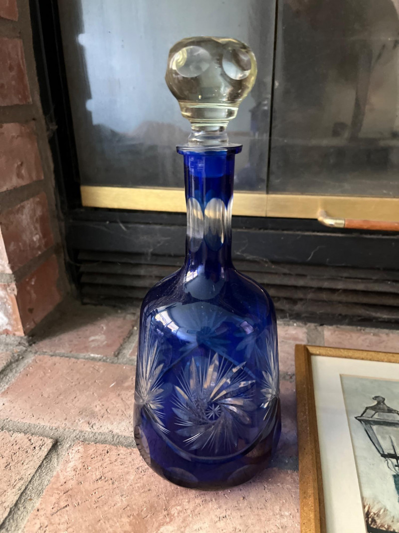 Cobalt Blue Glass Decanter, Van Gogh Print, Wooden Highland Cow Decor, Hen-Feathers cherub angel wall plaque Lot All Items Pictured Are Included In Lot