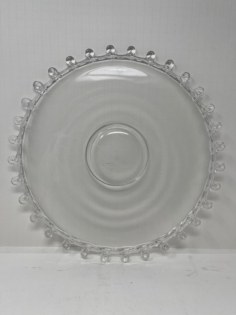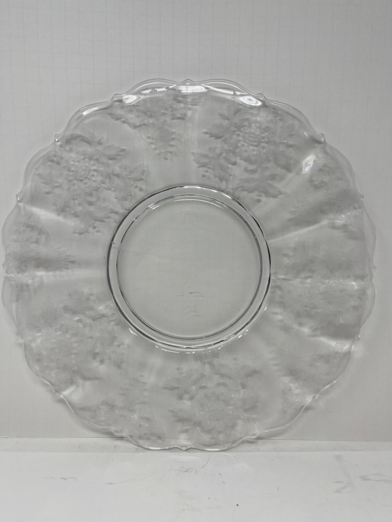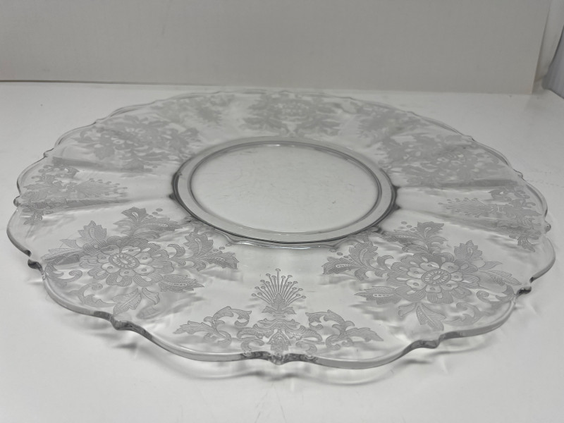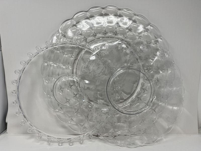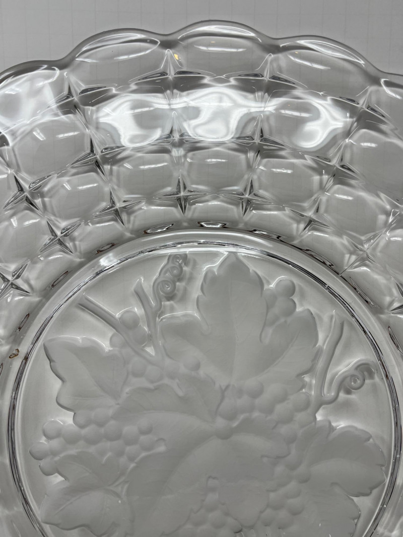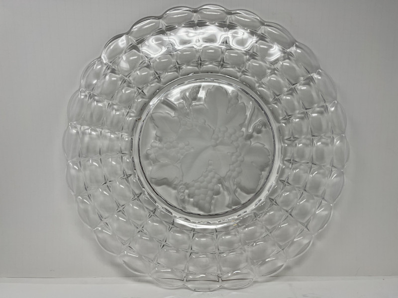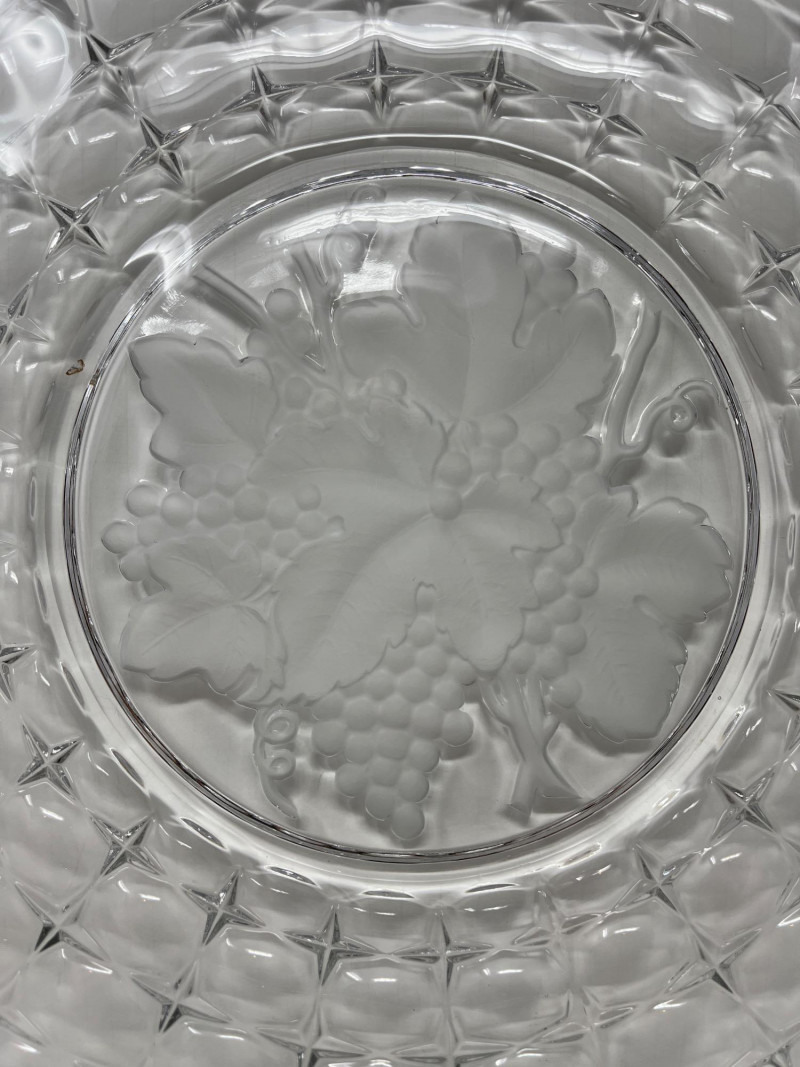 Lot Includes: Floral Serving Platter, Heisey Lariat Serving Platter w/ Beaded Edge, Constellation Grape Frosted torte plate by Indiana Glass. The pattern features frosted grapes and leaves in a square design Great Condition