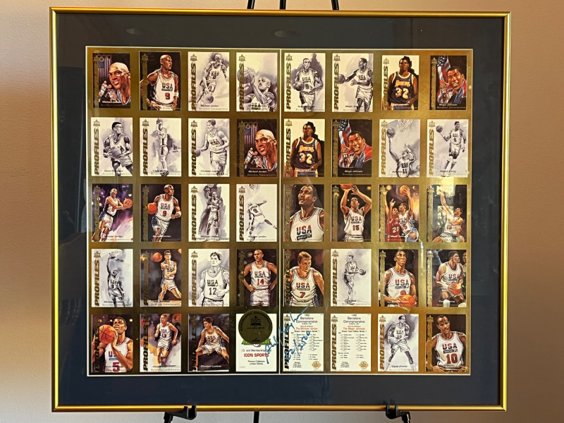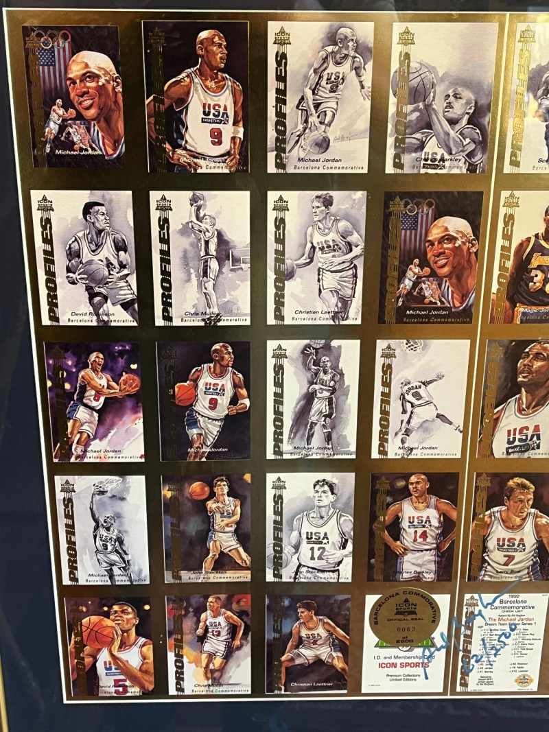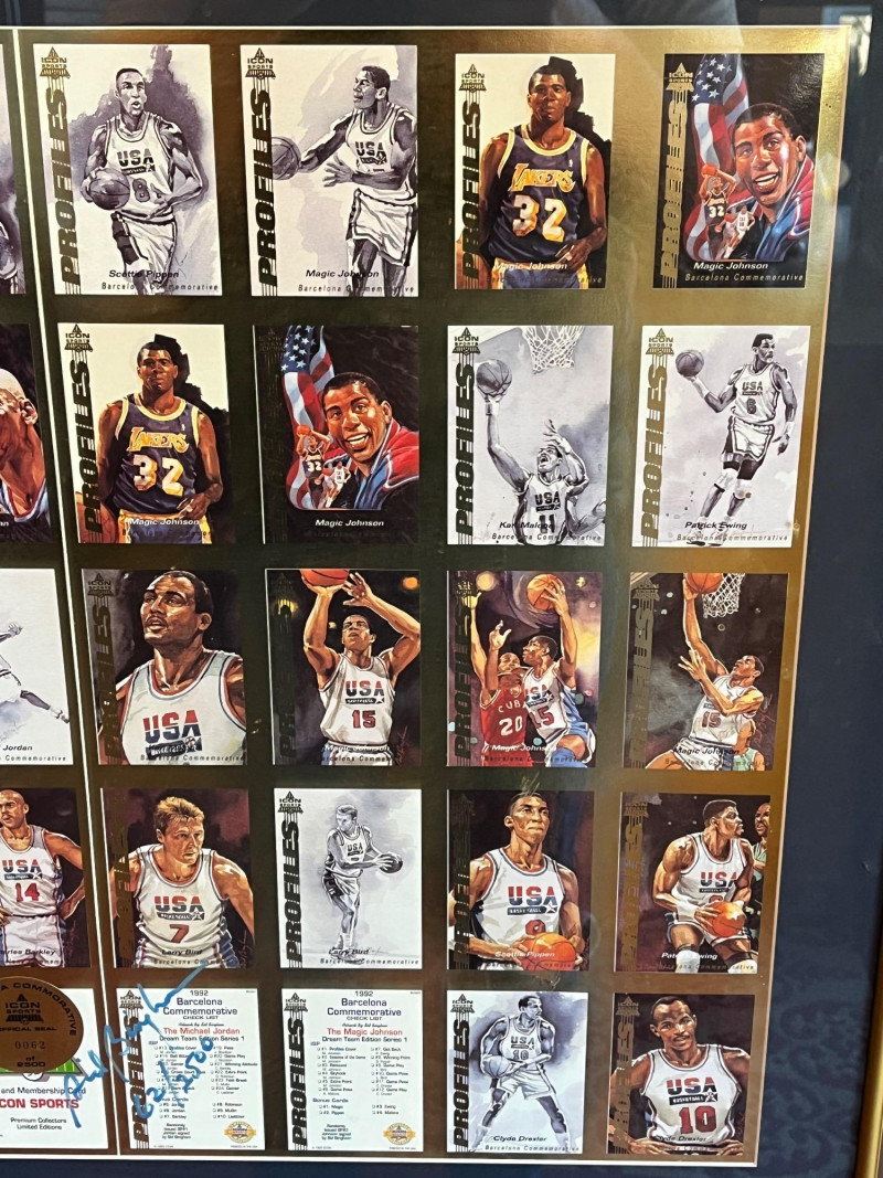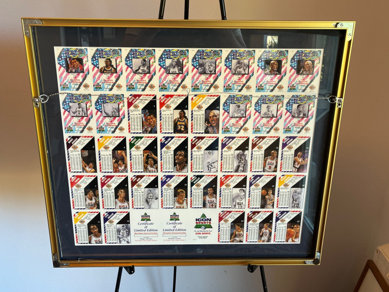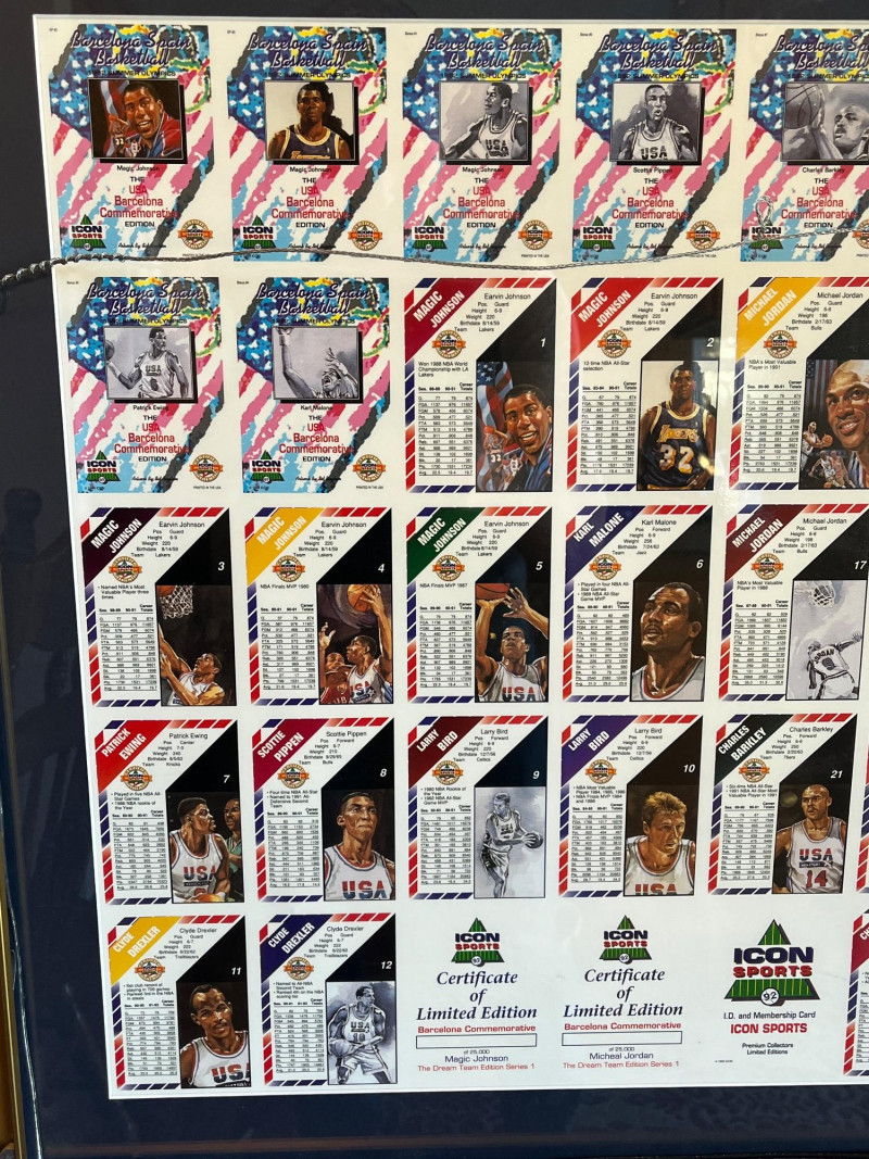 Uncut 1992 Framed "Dream Team" Card Sheet 23x26 Uncut Card Sheet is ‘Icon Sports Limited Edition Uncut Card Sheet’ Numbered 62/2500 1992 Barcelona Olympics Unknown Autograph On Back of Frame Frame Dimensions: 22x26