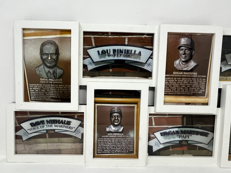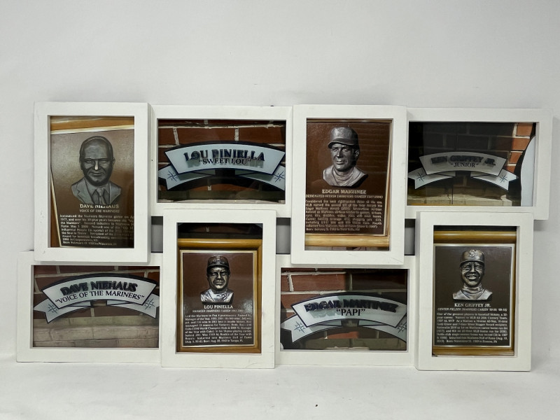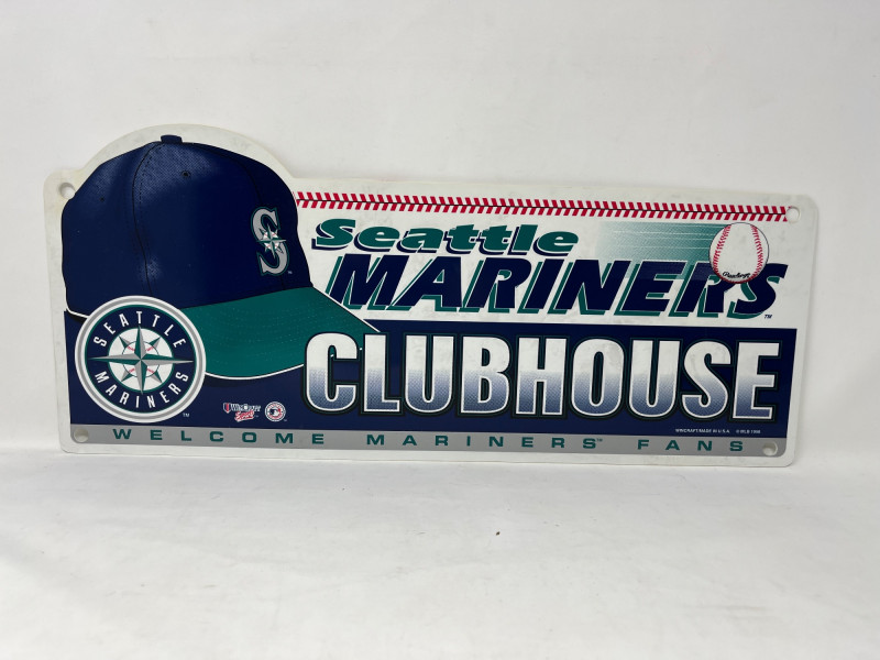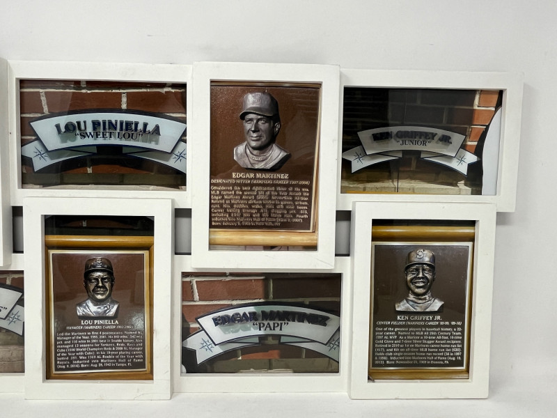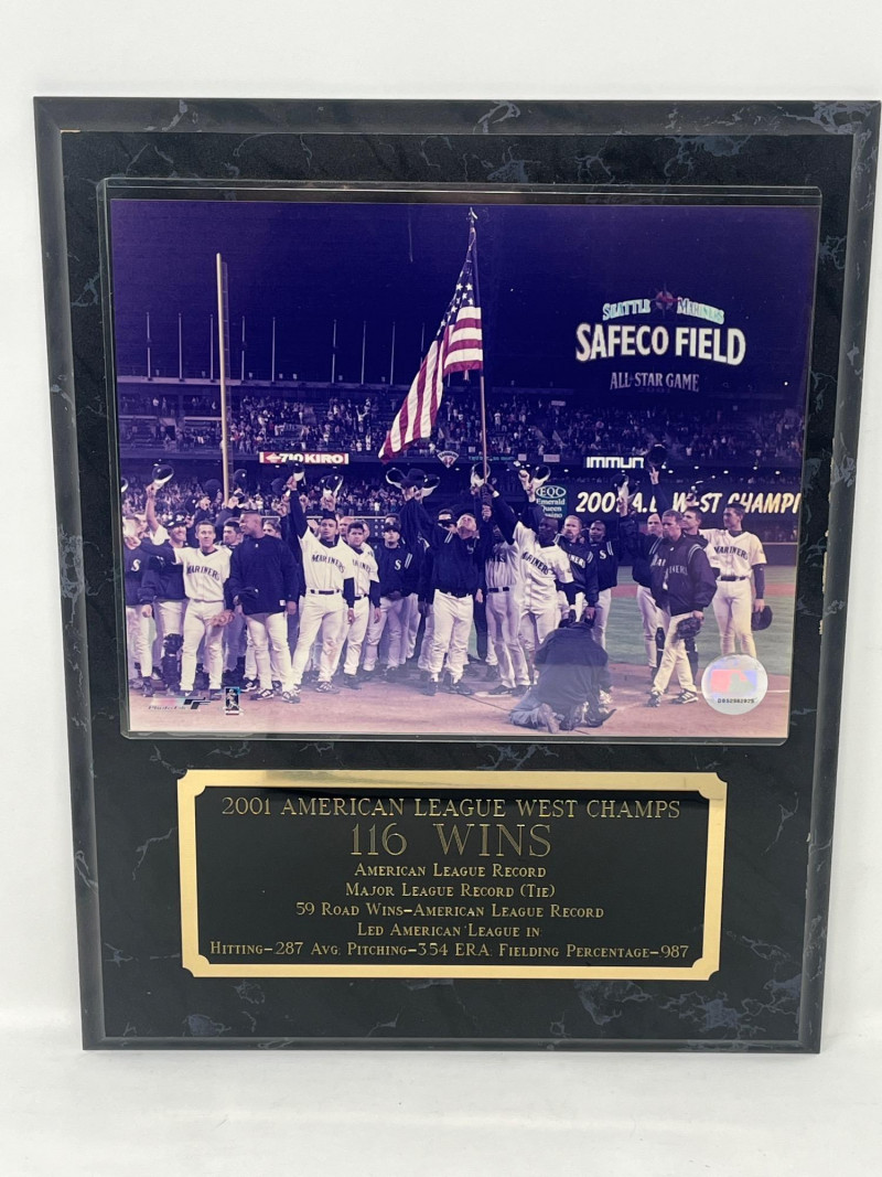 Lot Includes: Mariners Pennant, 116 Win Commemorative Plaque, Mariners Clubhouse Fan Sign, Framed Photo Collage of Mariners HOF Inductees