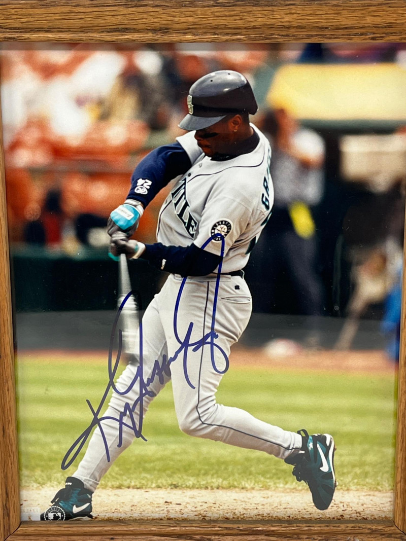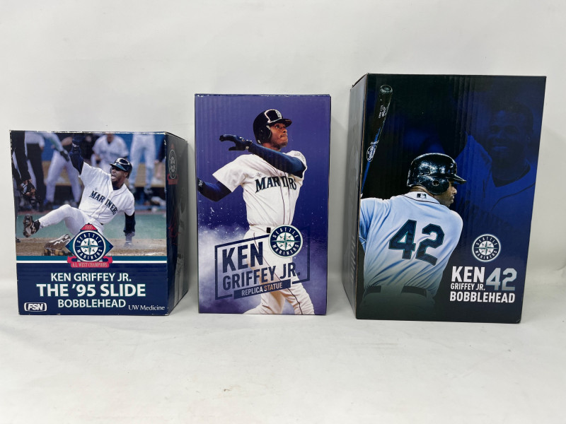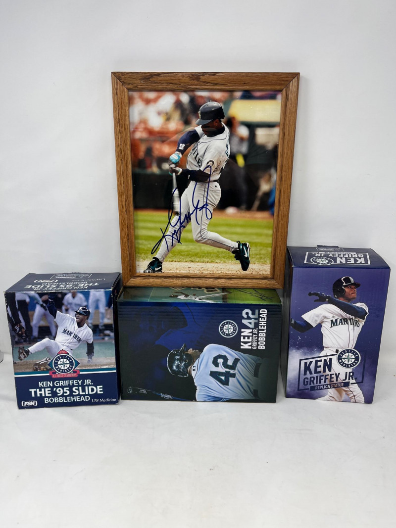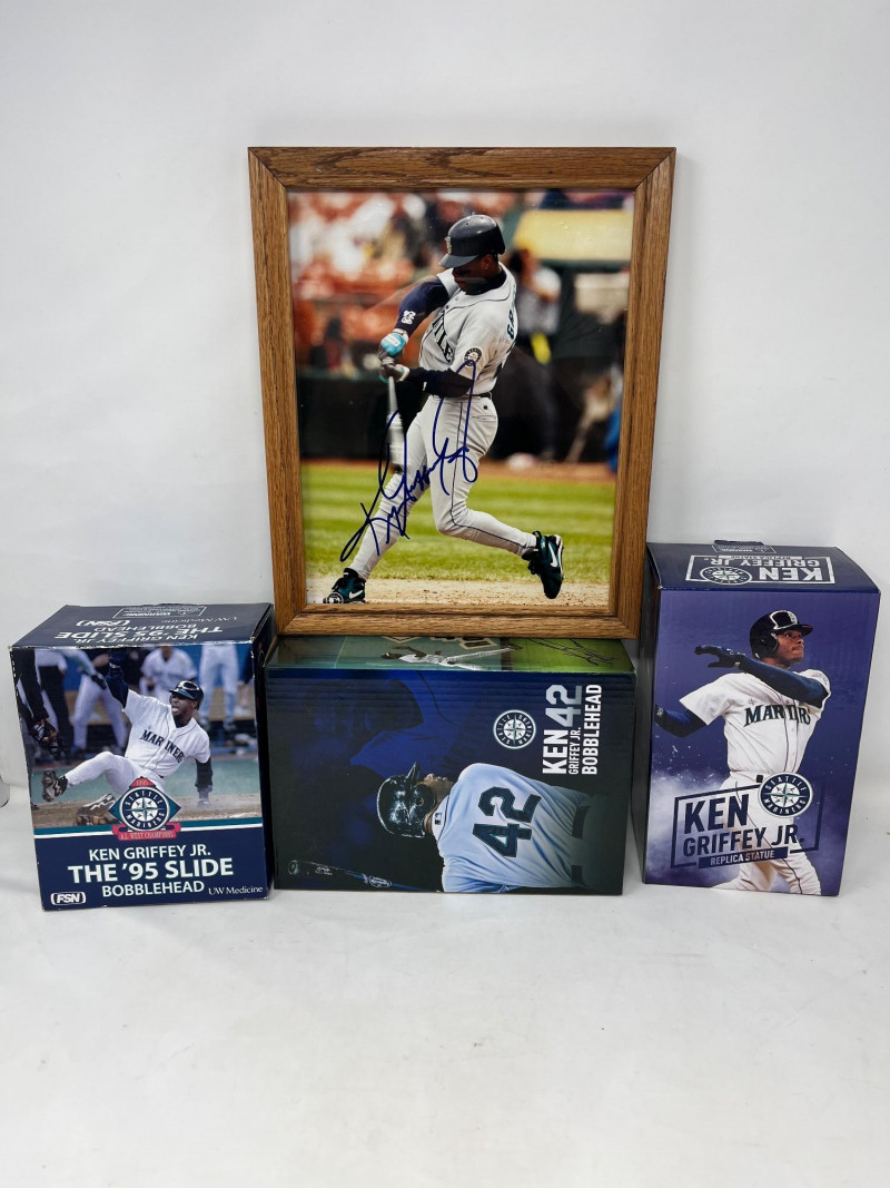 Ken Griffey Jr Signed 8x10 Photo + 3 Bobbleheads Lot Includes: Signed & Framed Ken Griffey Jr 8 x 10 Photo w/ COA Craig Griffey & Ken Griffey Jr. 8x10 Photo Griffey 1995 "The Slide" Bobblehead, Ken Griffey Jr. Collectible Statue, Ken Griffey Jr "42 Jackie Robinson" Bobblehead All bobbleheads are w/ original packaging and box.