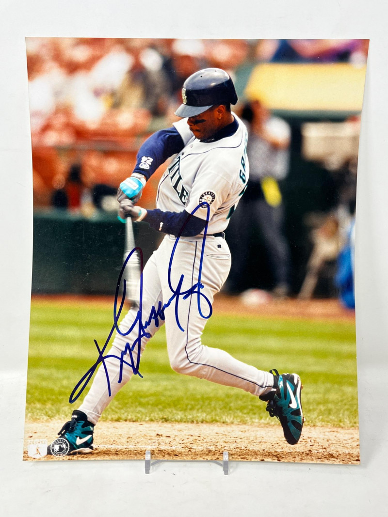 Lot # 65 - Ken Griffey Jr Signed 8x10 Photo + 3 Bobbleheads