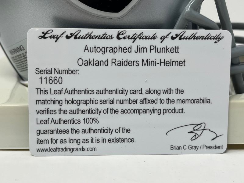 Jim Plunkett Signed/ Authenticated Mini Helmet Authenticated by Leaf Authentics Helmet In Original Mini Helmet Packaging