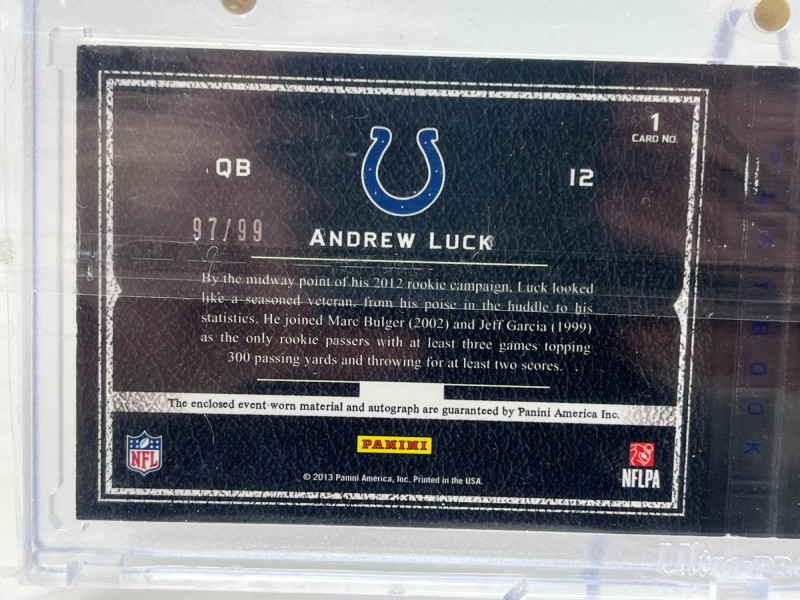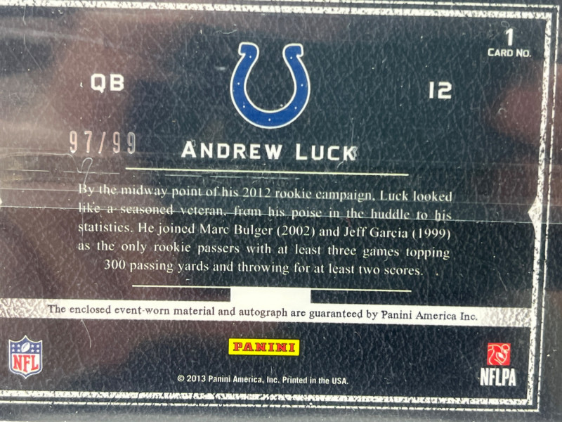 2013 Panini Playbook Andrew Luck Rookie Patch Booklet Autograph #'d 97/99 Card is mint!