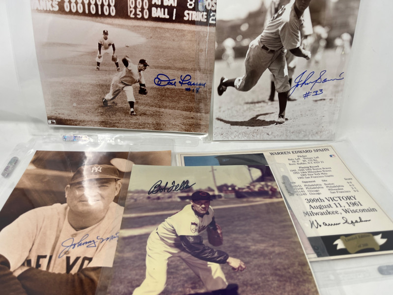 5 MLB Legend HOF'er Autographed 8 x 10's Lot (Feller) Legends Include: Bob Feller, Johnny Sain, Johnny Mize, Warren Spahn, Don Larsen