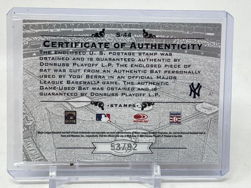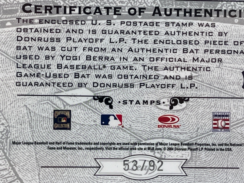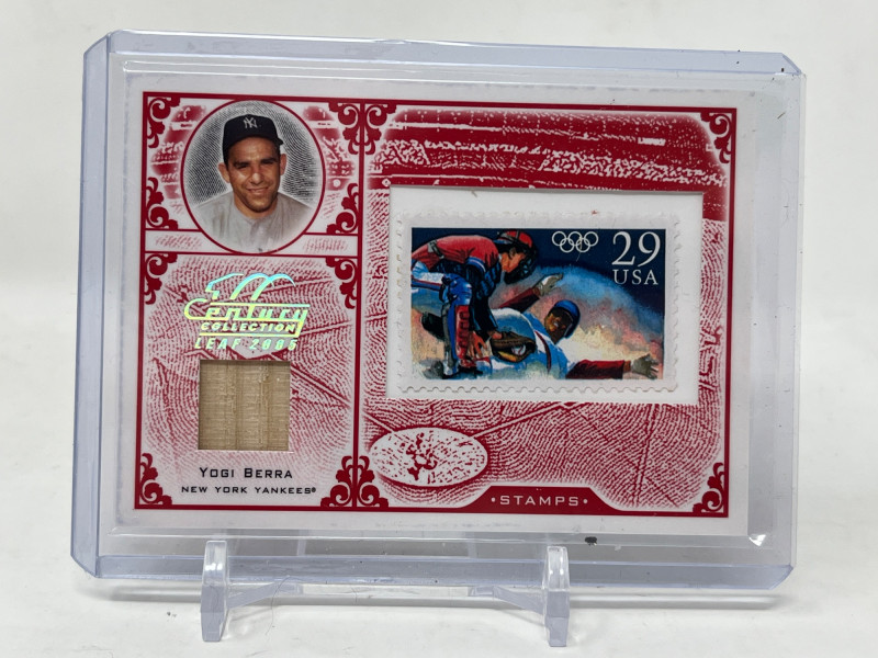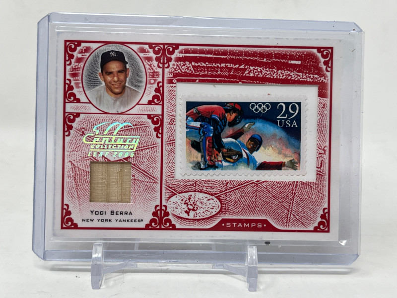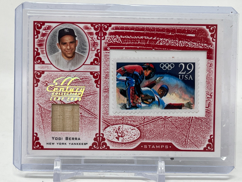 2005 Leaf Century Stamp Postmark Olympic Relic Serial Numbered 53/92 Yogi Berra Game Used Bat Card Card Is Mint