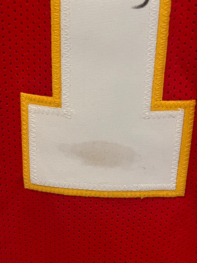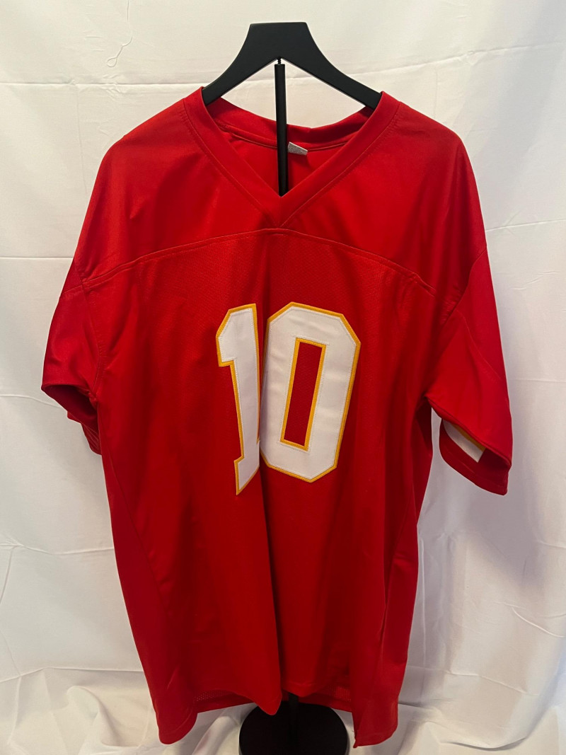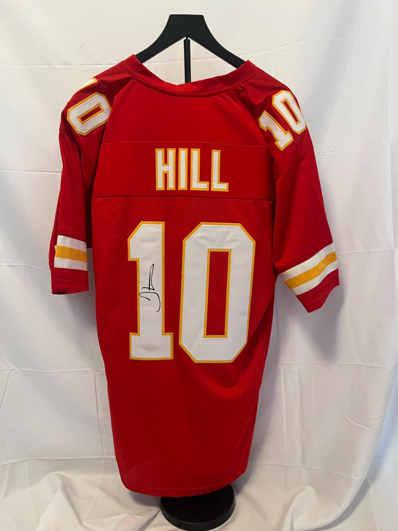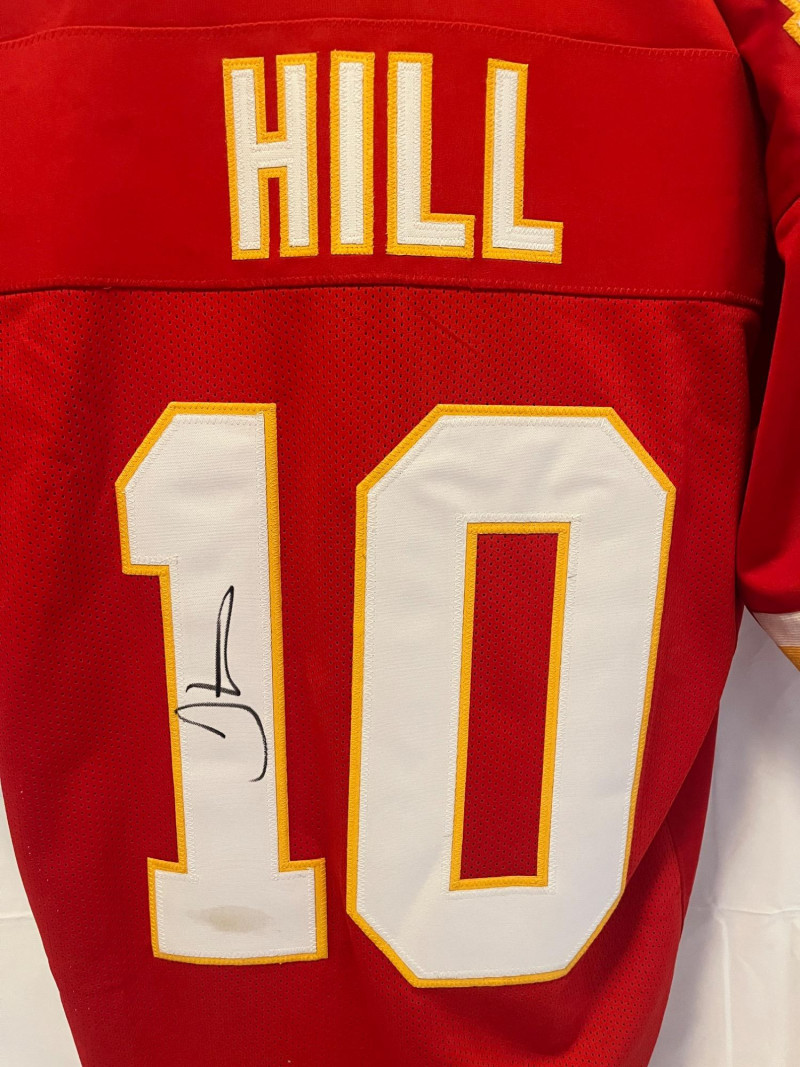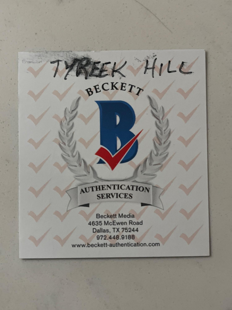 Tyreek Hill Authenticated & Autographed Jersey Authenticated by Beckett Size XL See stain on the number one. I believe the authentication hologram was there but no longer left that mark. Owner kept COA w/ name on it.