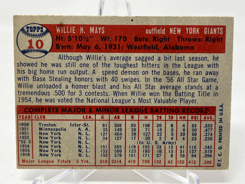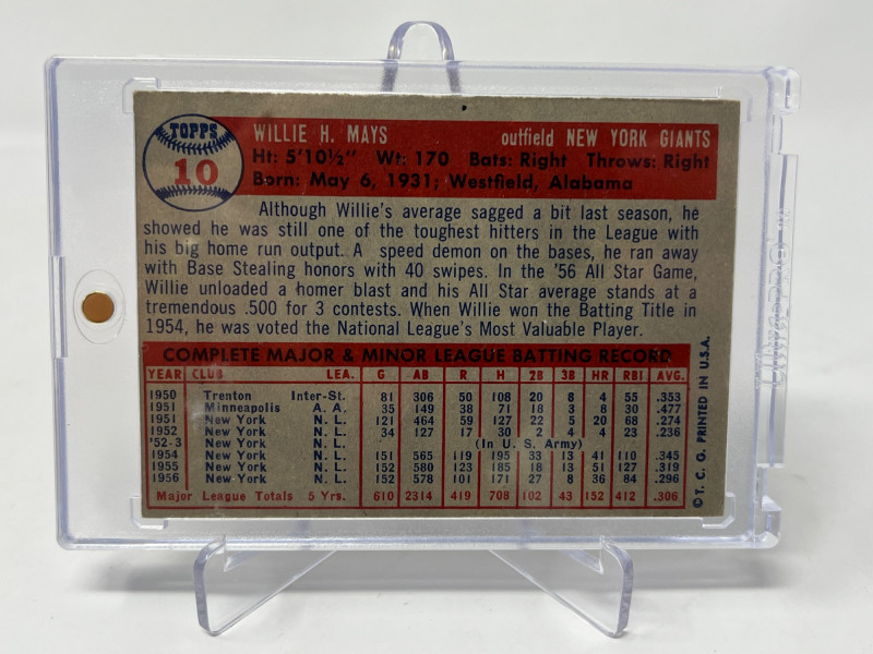 1957 Topps Willie Mays (Ungraded/Raw) Kept in one touch. Opinion: If graded this would be PSA 4.