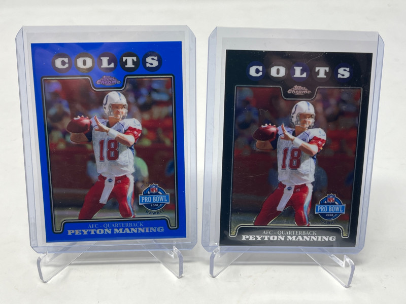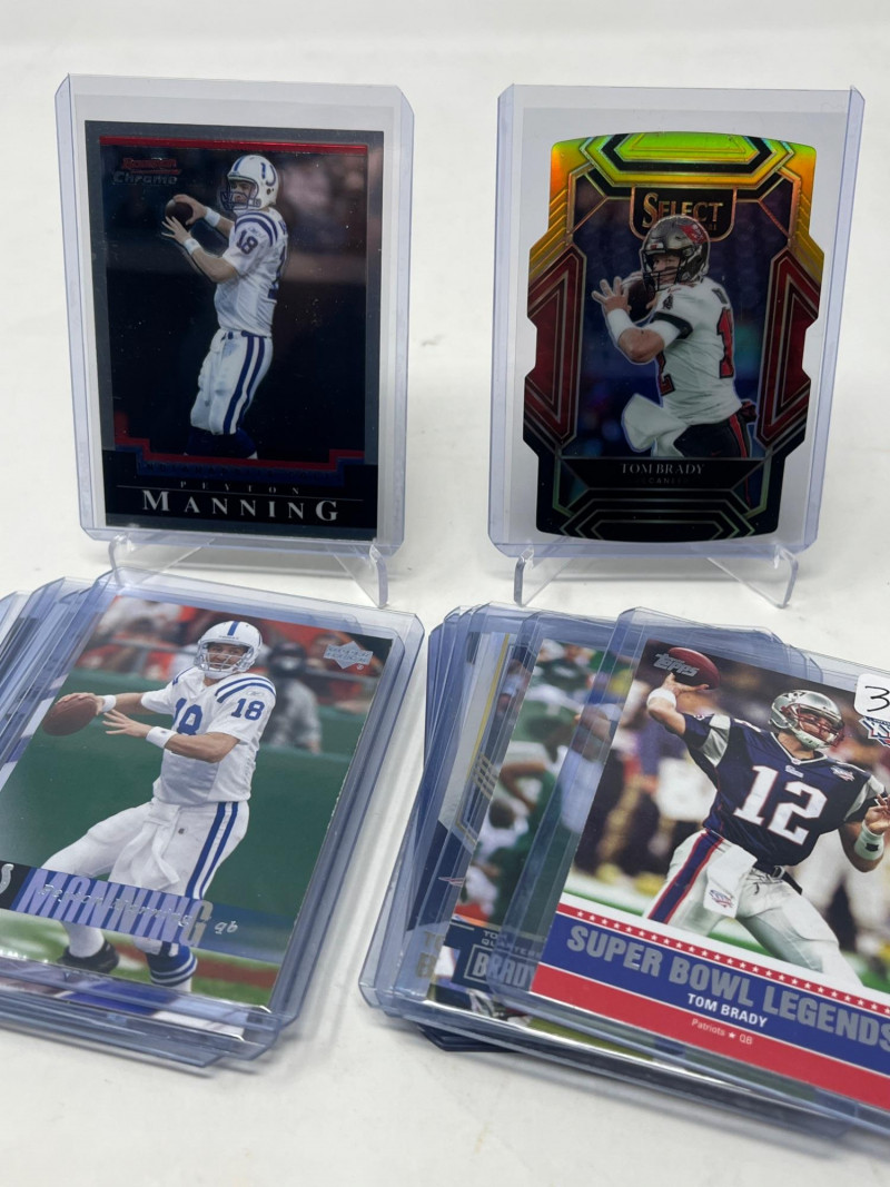 Lot of 9 Tom Brady Cards (All Cards Pictured) Lot of 7 Peyton Manning Cards (All Cards Pictured) Cards NM+ Sleeved & Top Loaded