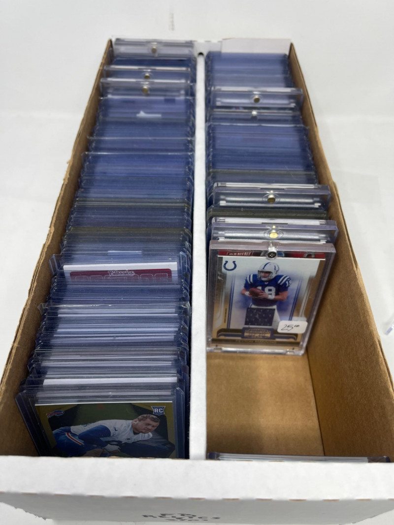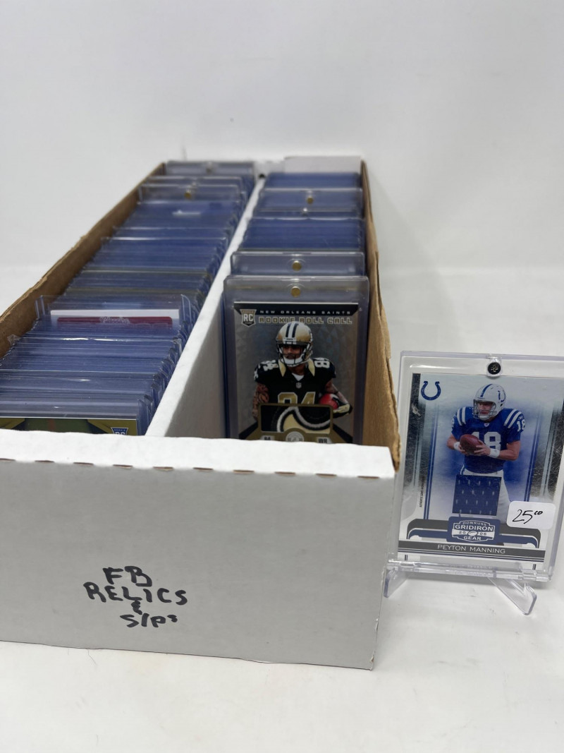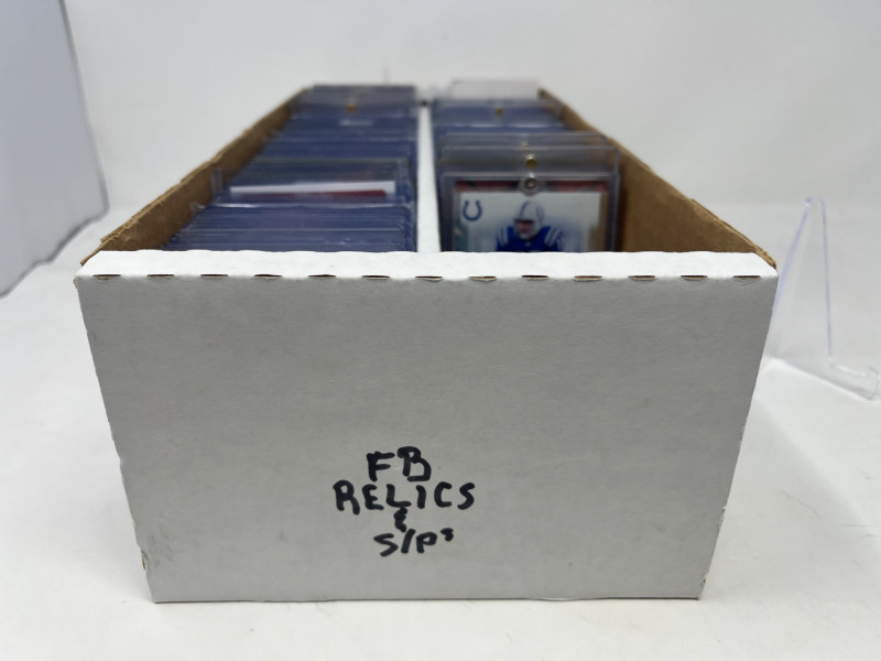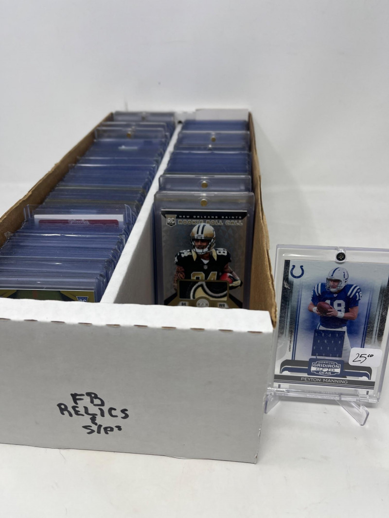 Large Lot of NFL Relics and Short Prints (Manning, Gronk, Stars!) 2 Row Box of NFL Rookies, Stars, Relics, & Short Prints Most of the names in the box are recognized by casual NFL fans. Great players! 2 Row Box About 80% Full 150+ Cards Estimated. All Sleeved and Toploaded All Cards Not Pictured