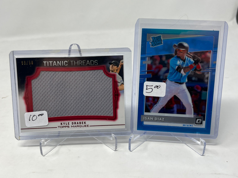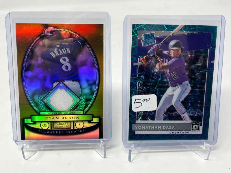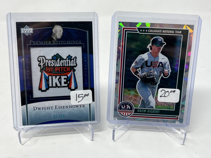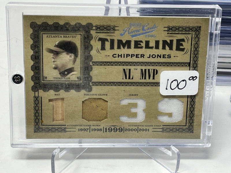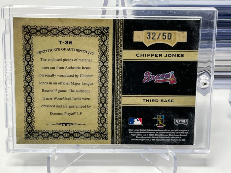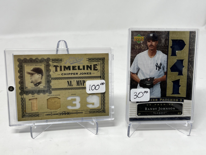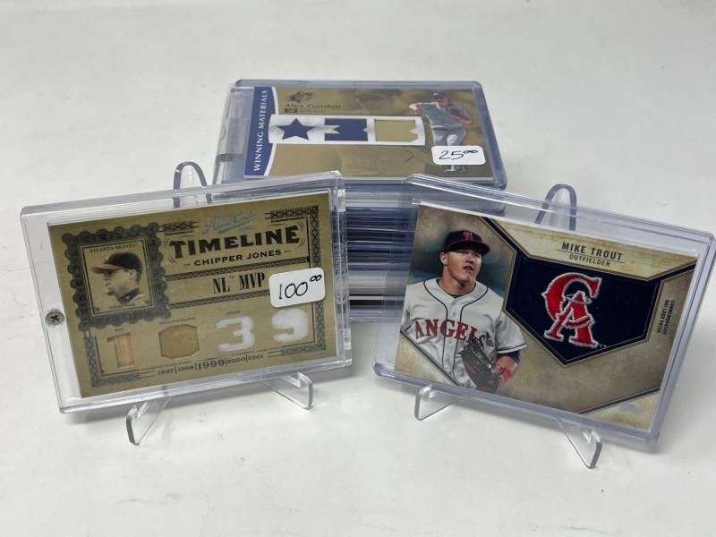 Lot of 20 High End/Low Numbered Sports Cards (Chipper, Trout, Maddux) All Cards In Lot Pictured. All Cards Sleeved & Top Loaded See Chipper Jones Quad Relic from 2006 Prime Cuts/50, Trout Commemorative Patch, Game Used Relics from Randy Johnson, Greg Maddux, Joe Mauer, & More!