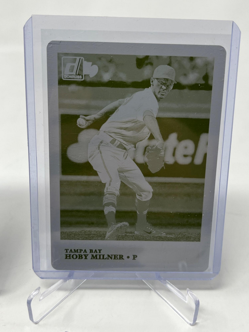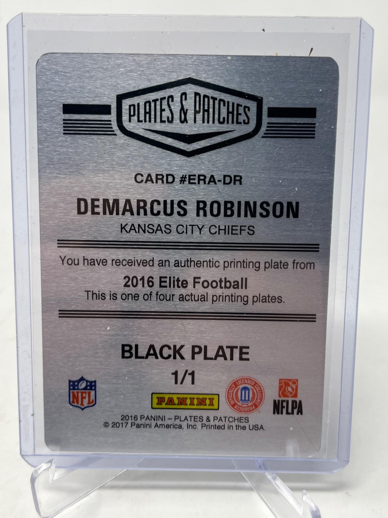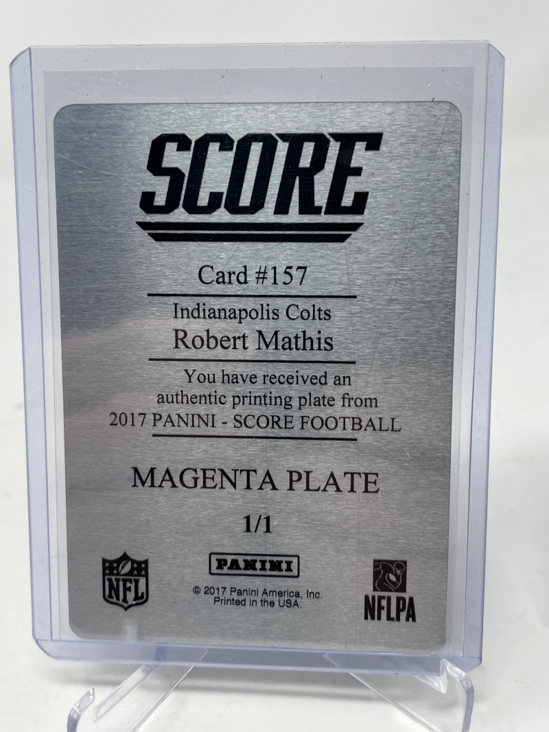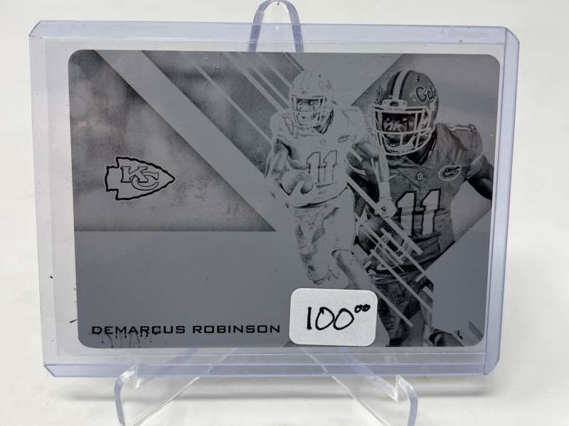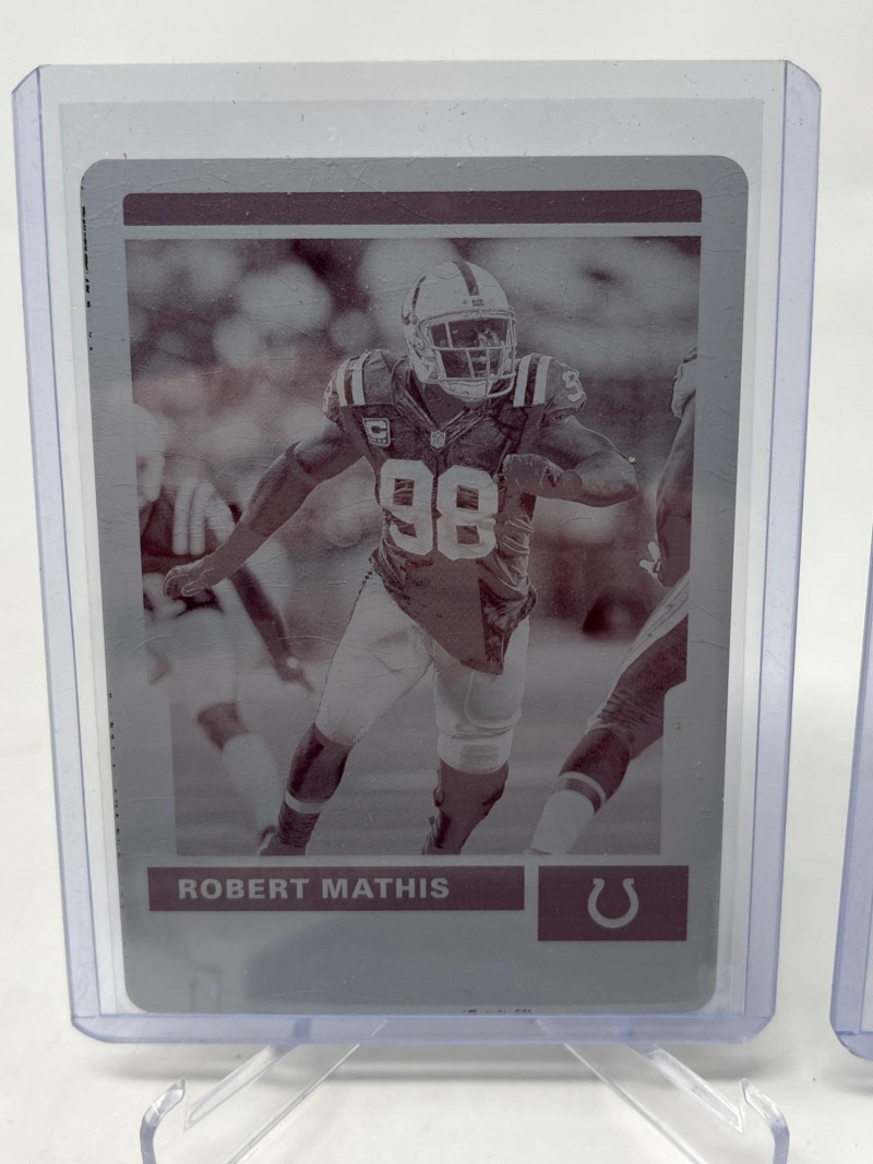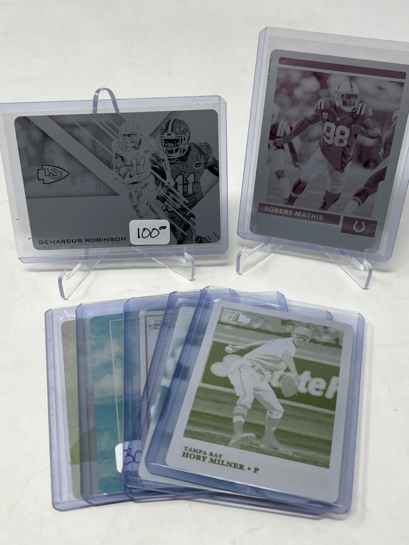 Lot of 7 Printing Plate 1 of 1's (Robinson, Mathis) All Cards Pictured Front & Back. All One of One Printing Plates! Players Include: Demarcus Robinson, Robert Mathis, Hoby Milner, Danny O'Rourke, Pedro Baez, Casey Kotchman, Ryan Kerrigan