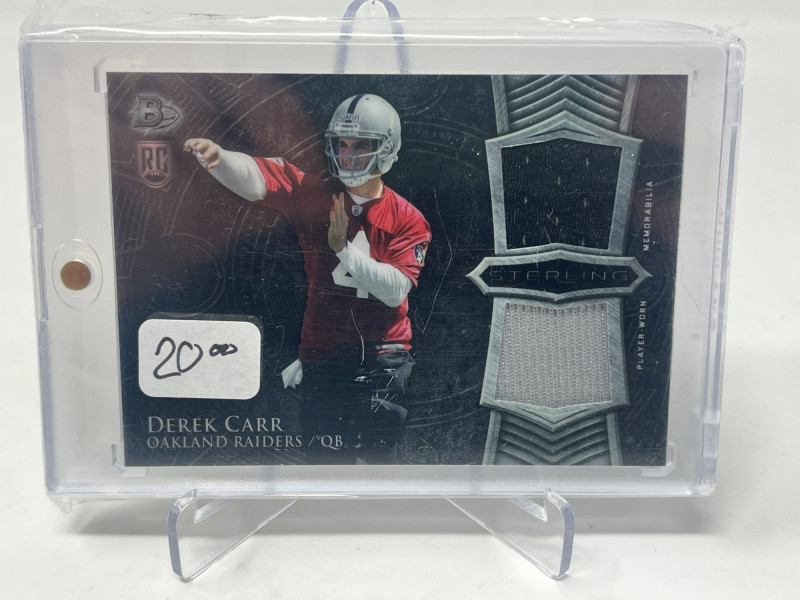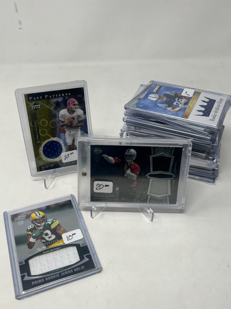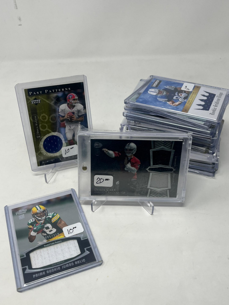 Lot of 25 NFL Relics (Carr, Dalton, Flutie) All Cards Pictured Above All cards Sleeved & Top Loaded Players Include: Derek Carr Rookies, Randall Cobb, Andy Dalton, Doug Flutie + More