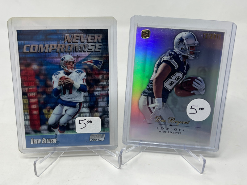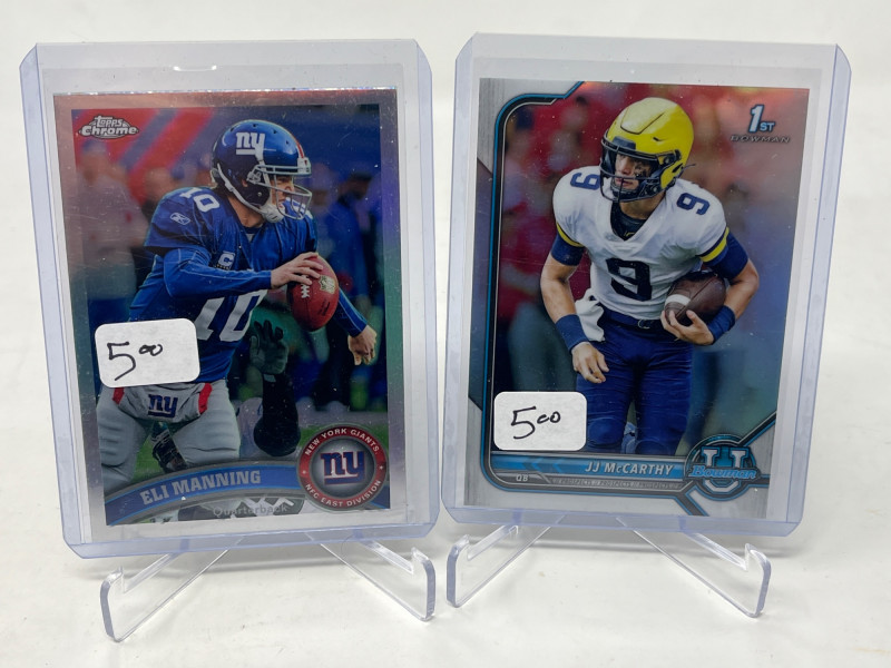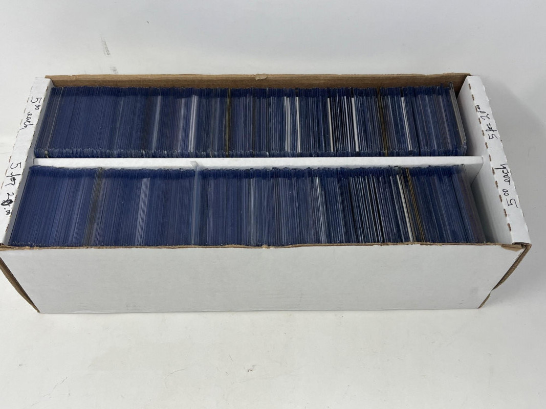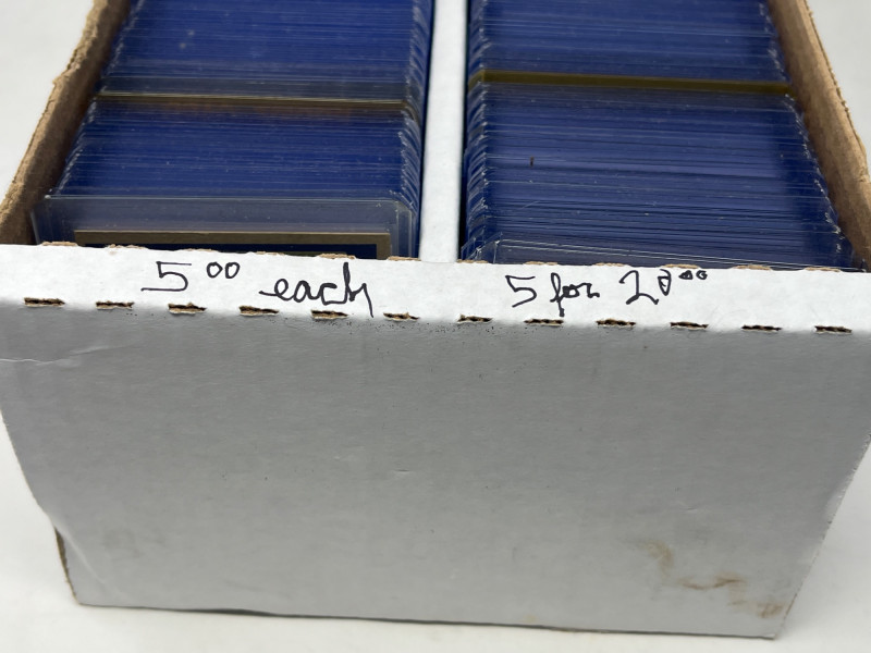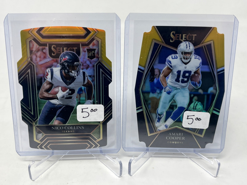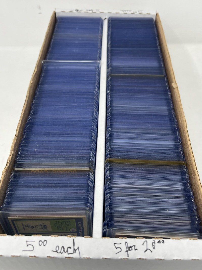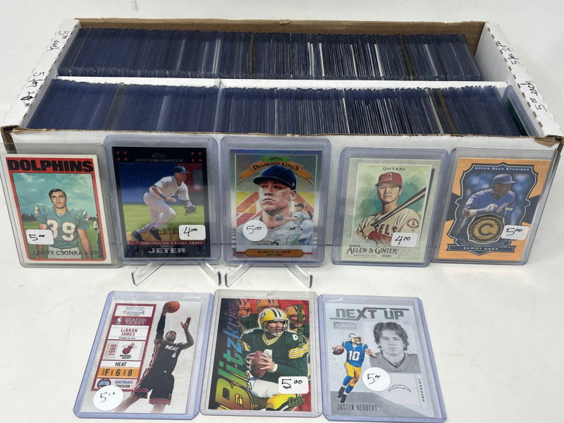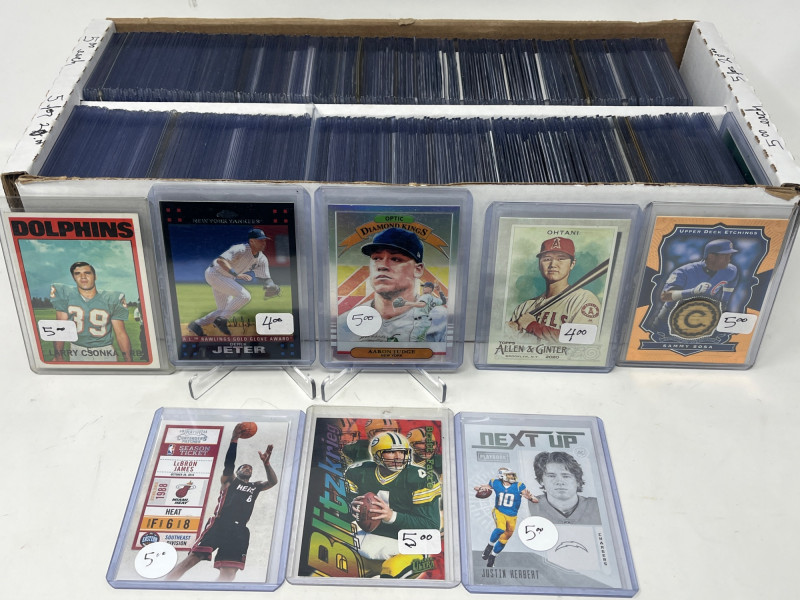 2 Row Box NFL/NBA/MLB Stars & Inserts! This box was priced at $5 per card for card show. Left Side Row is MLB. Right Side Row Is Mostly NFL. Less Than 20 NBA Cards. Not All Cards Are Pictured All Cards Sleeved & Top Loaded
