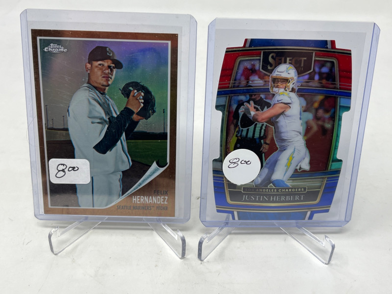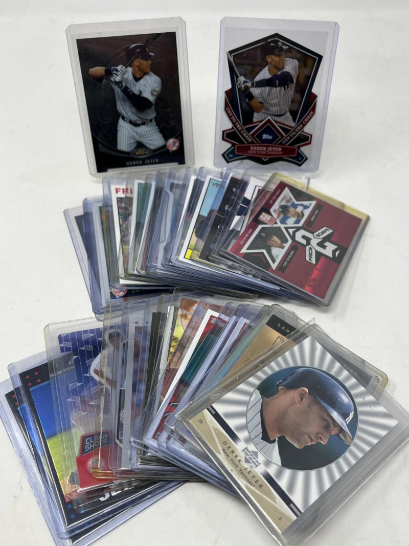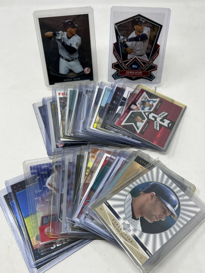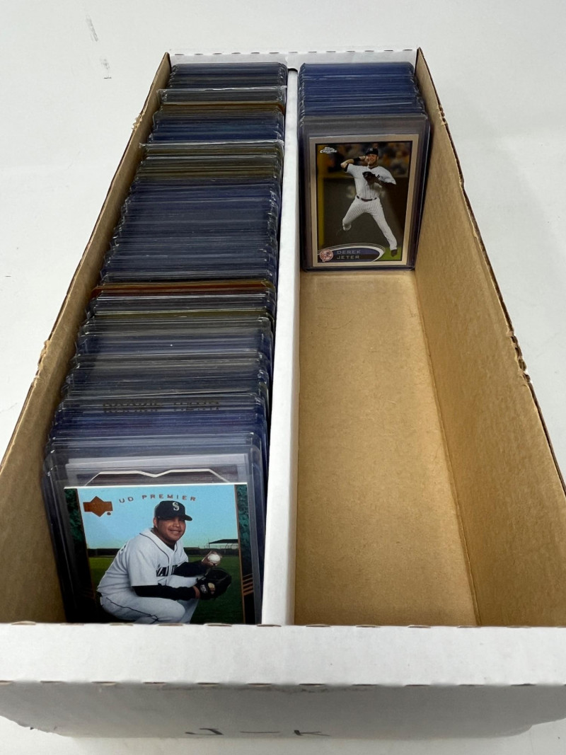 Large 2 Row Box Of Sports Cards.(Jeter, C. Jones, NFL) Box Contains: Large Amount of Jeter 30+ Cards , Chipper Jones, Andruw Jones, Randy Johnson, Justin Herbert, + More Not All Cards Are Pictured All Cards Are Sleeved & Top Loaded Box Approx 60% Full
