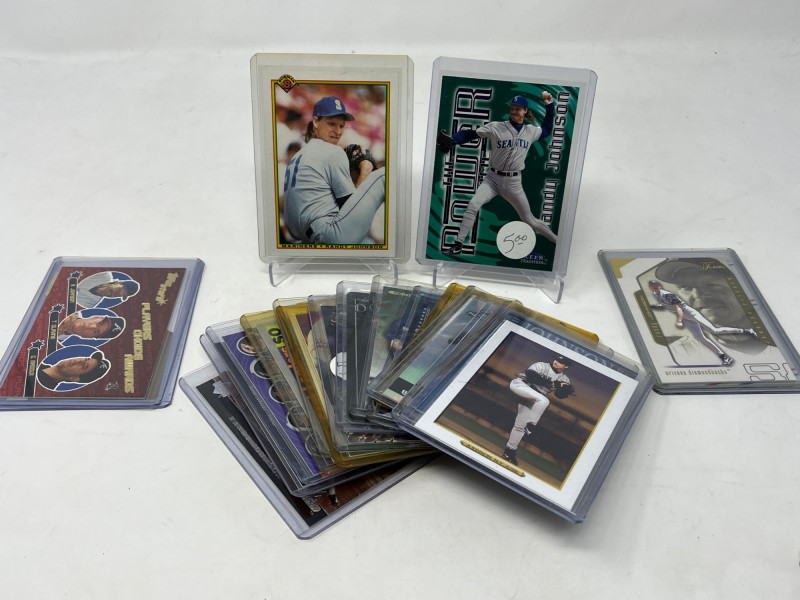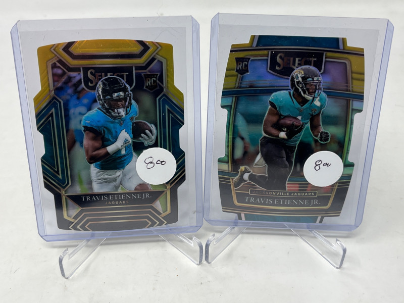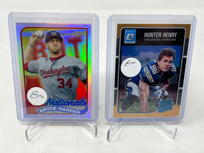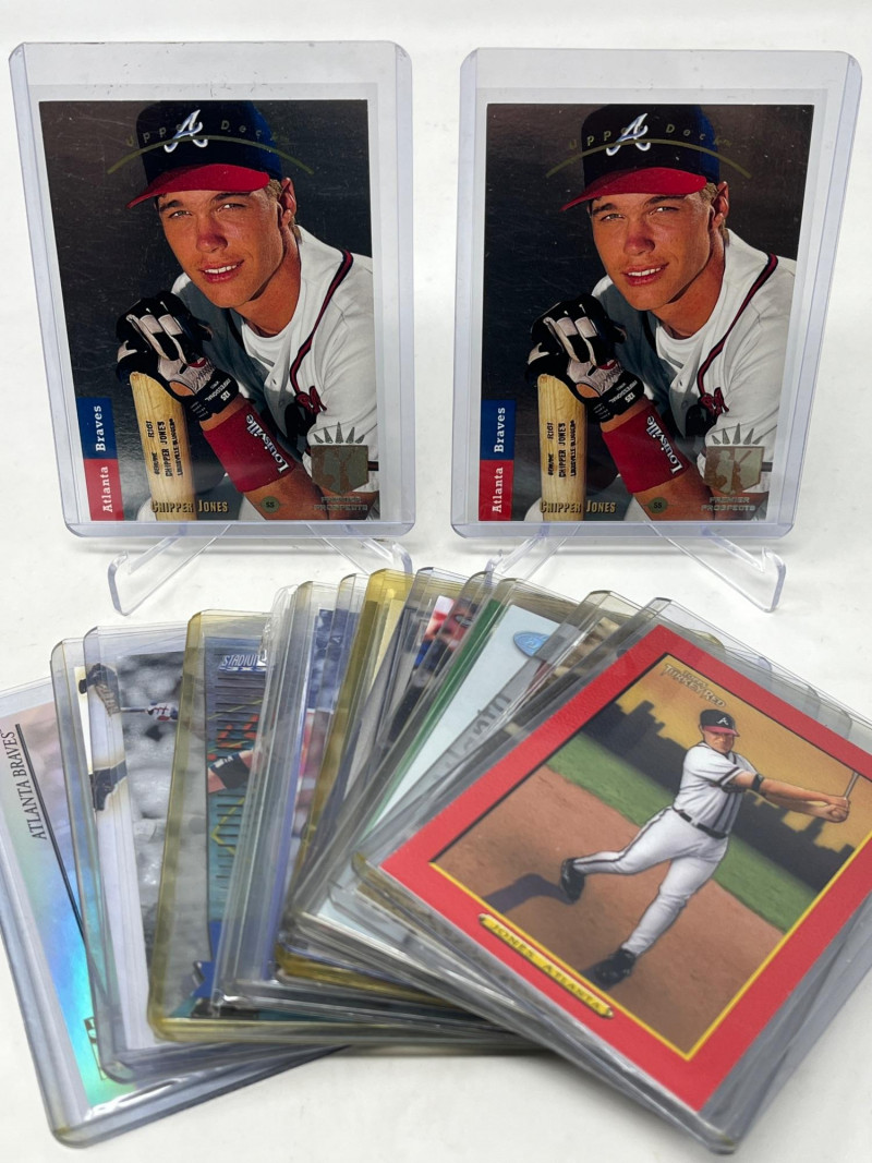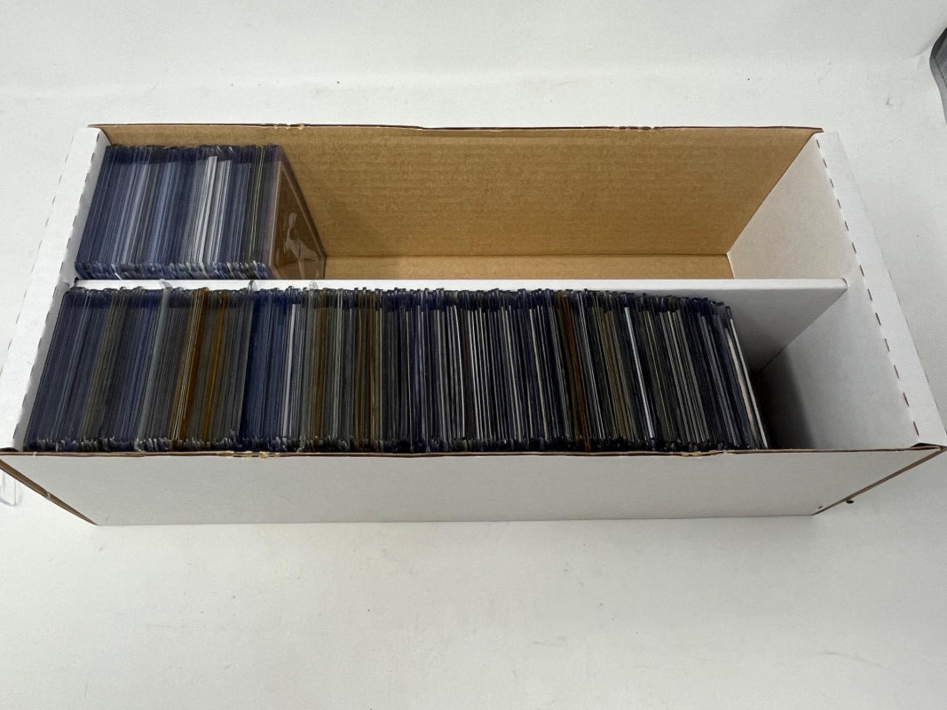 Large 2 Row Box Of Sports Cards.(Jeter, C. Jones, NFL) Box Contains: Large Amount of Jeter 30+ Cards , Chipper Jones, Andruw Jones, Randy Johnson, Justin Herbert, + More Not All Cards Are Pictured All Cards Are Sleeved & Top Loaded Box Approx 60% Full